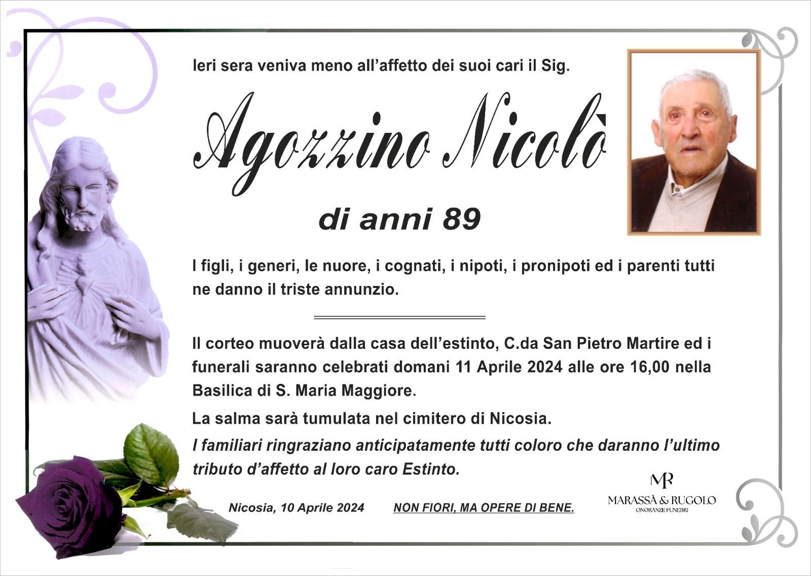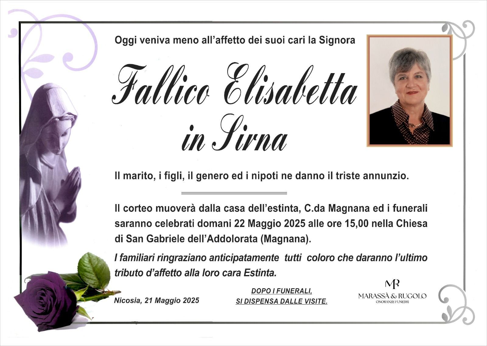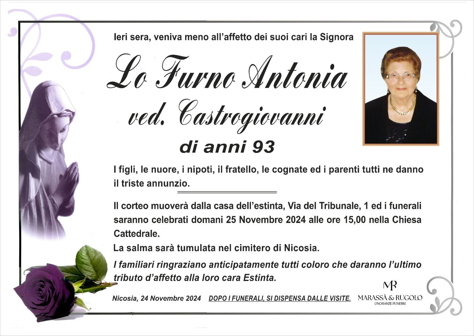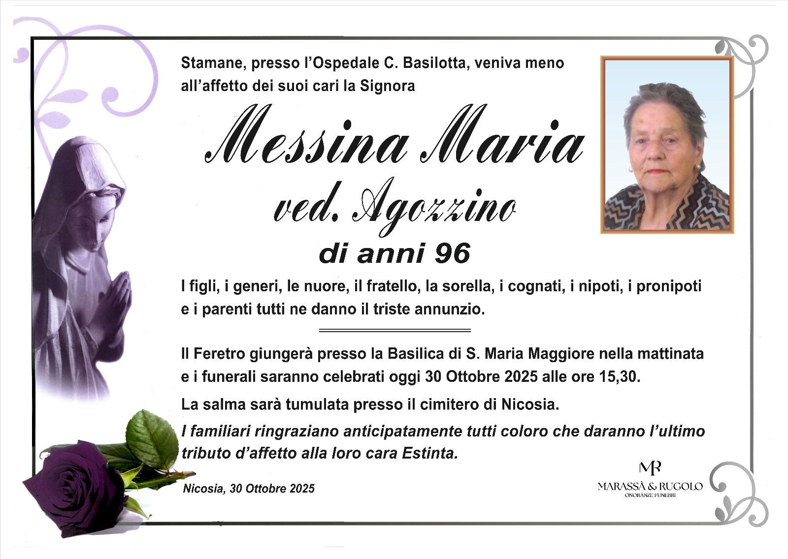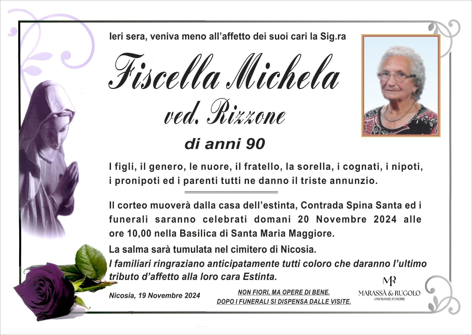 Dal 1980 l'agenzia di ONORANZE FUNEBRI MARASSA' & RUGOLO a Nicosia in provincia di Enna, effettua il disbrigo delle pratiche; trasporto delle salme in Italia e all'estero; realizzazione di articoli funerari; personalizzazione di marmi e graniti per lapidi. Ed ancora: addobbi funebri; allestimento camere ardenti; cremazione; disbrigo pratiche funerarie; pratiche cimiteriali; servizi funebri; servizi funebri completi; sigillatura casse e molto altro ancora.