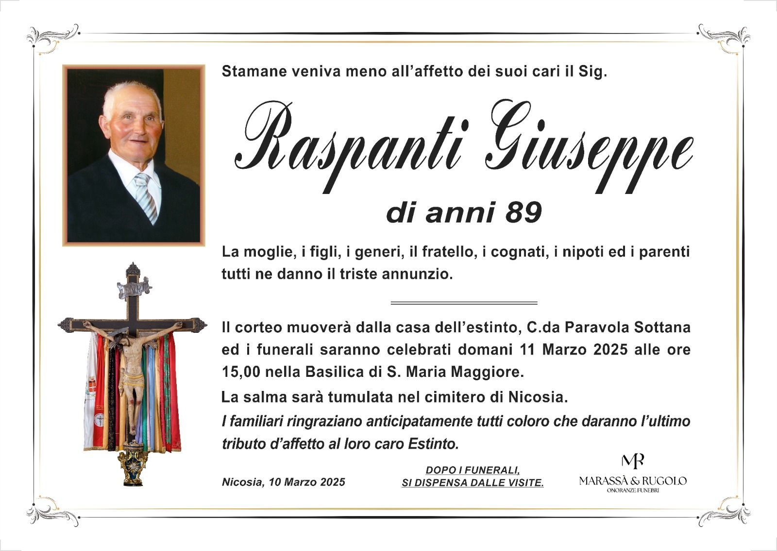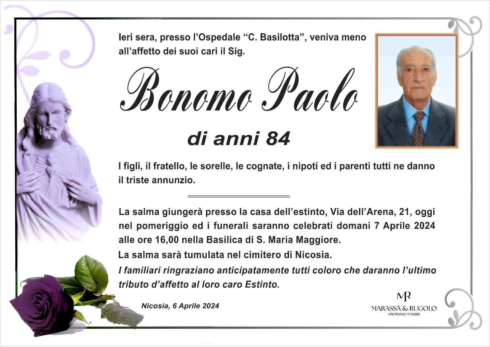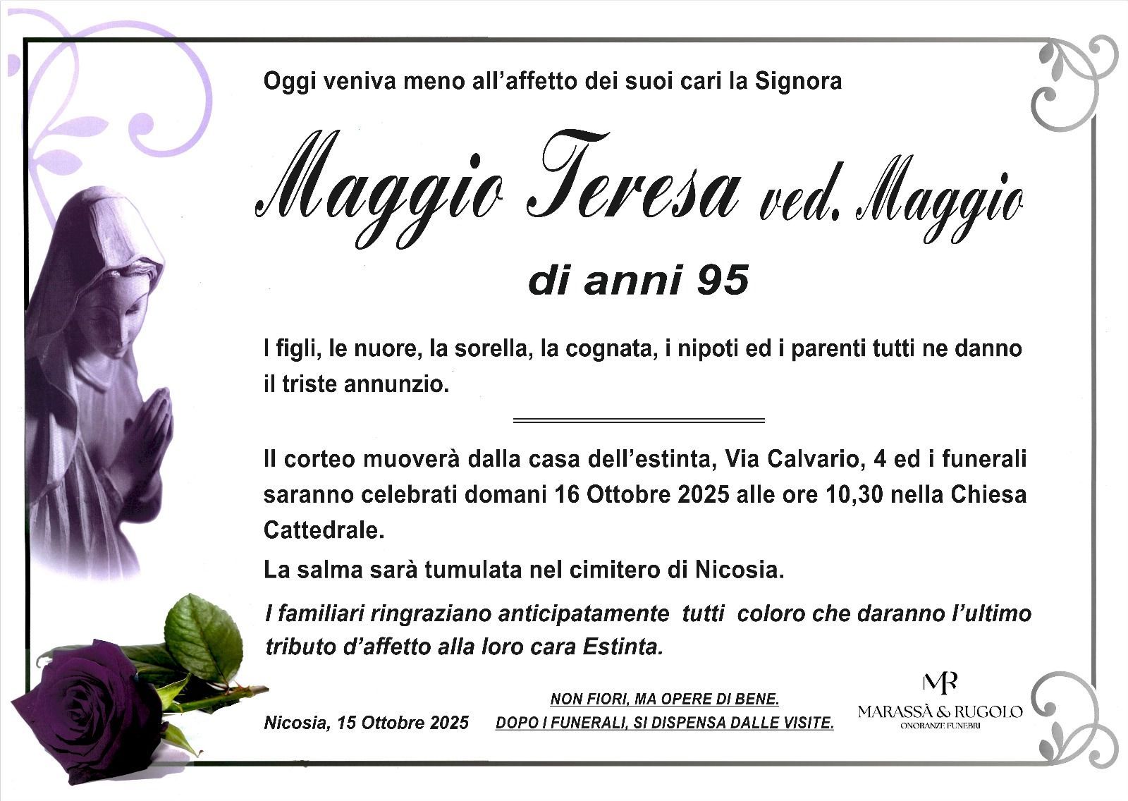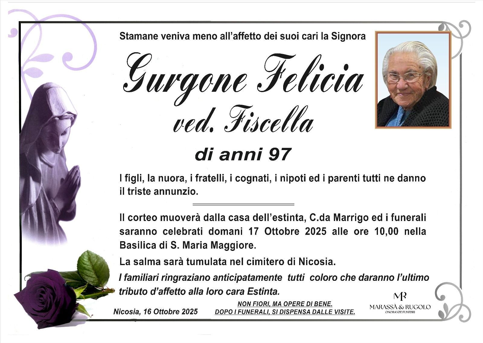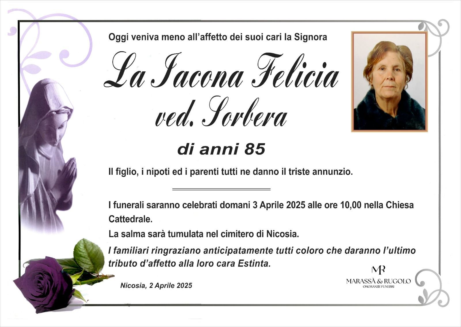 Dal 1980 l'agenzia di ONORANZE FUNEBRI MARASSA' & RUGOLO a Nicosia in provincia di Enna, effettua il disbrigo delle pratiche; trasporto delle salme in Italia e all'estero; realizzazione di articoli funerari; personalizzazione di marmi e graniti per lapidi. Ed ancora: addobbi funebri; allestimento camere ardenti; cremazione; disbrigo pratiche funerarie; pratiche cimiteriali; servizi funebri; servizi funebri completi; sigillatura casse e molto altro ancora.