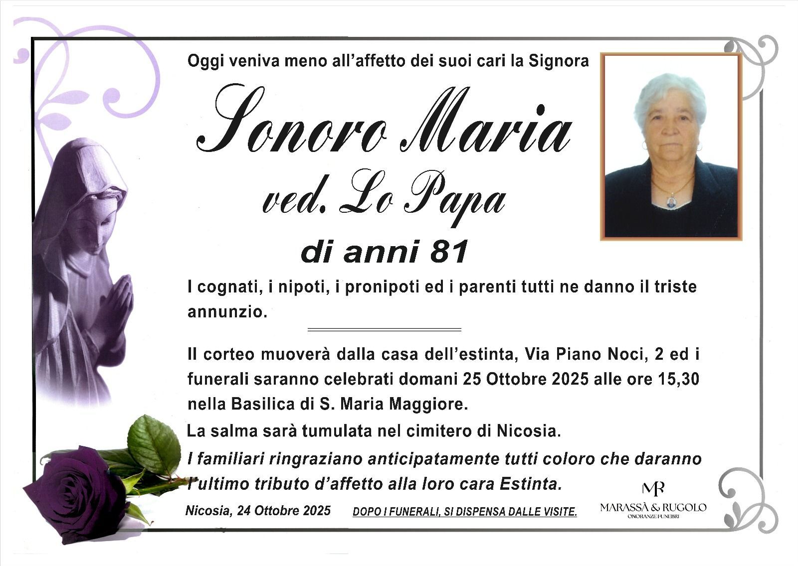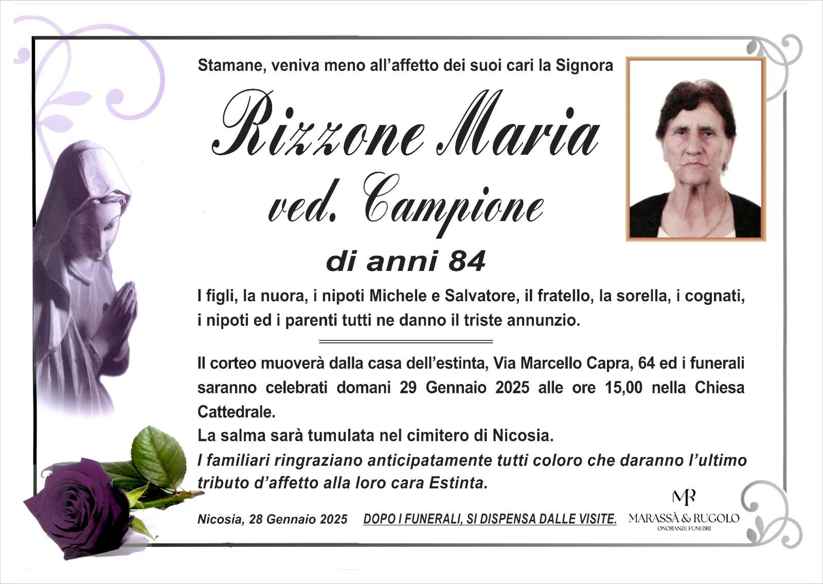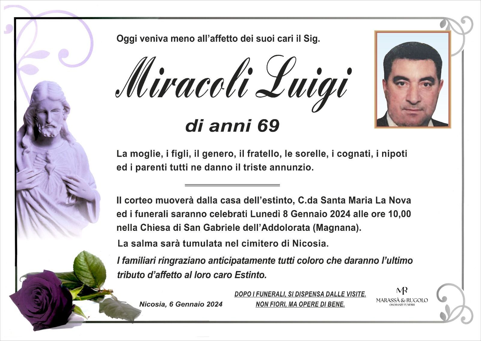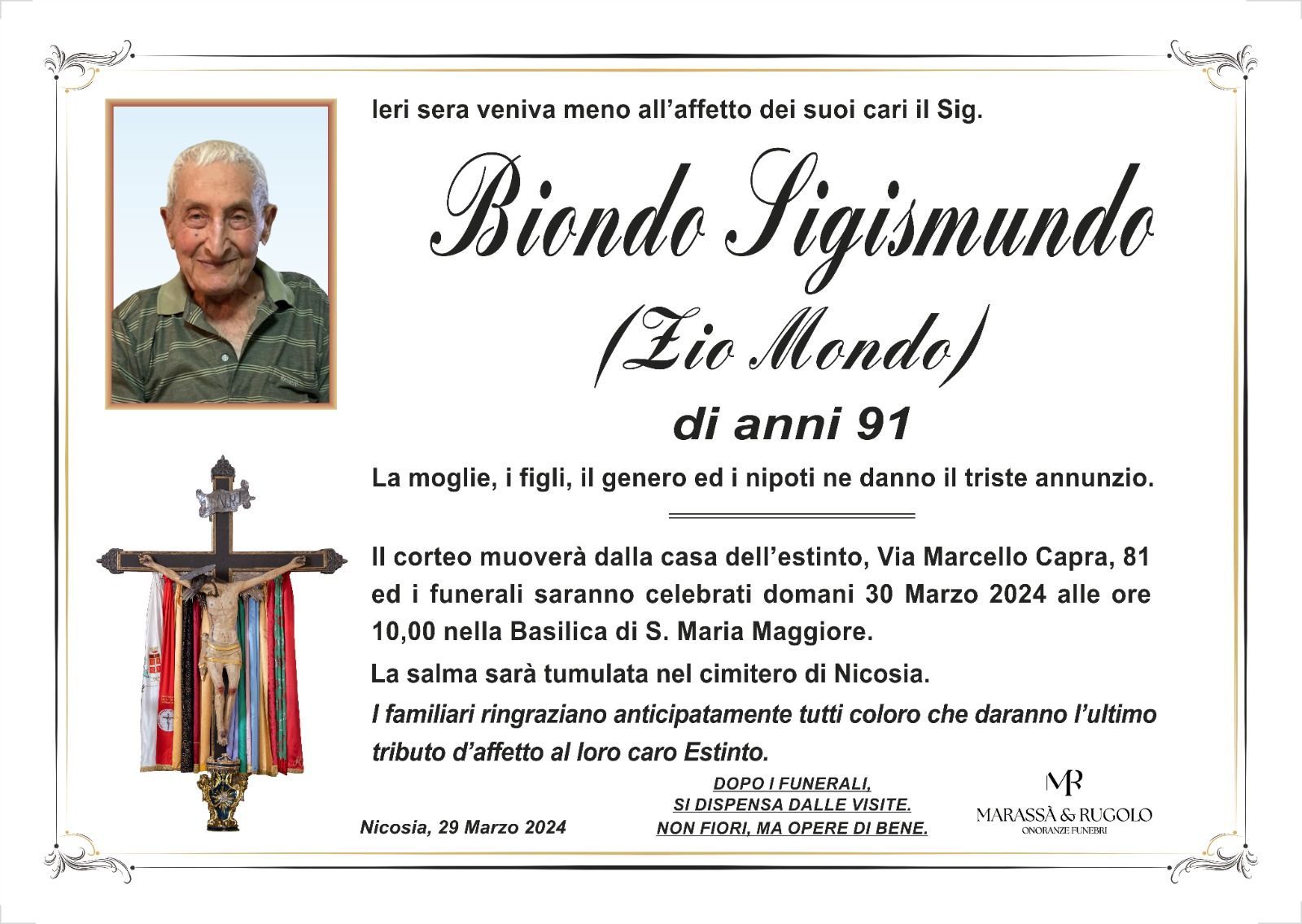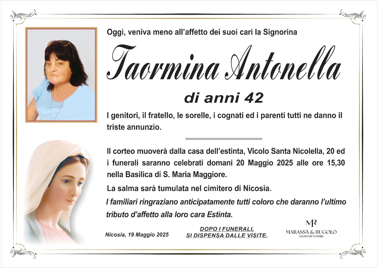 Dal 1980 l'agenzia di ONORANZE FUNEBRI MARASSA' & RUGOLO a Nicosia in provincia di Enna, effettua il disbrigo delle pratiche; trasporto delle salme in Italia e all'estero; realizzazione di articoli funerari; personalizzazione di marmi e graniti per lapidi. Ed ancora: addobbi funebri; allestimento camere ardenti; cremazione; disbrigo pratiche funerarie; pratiche cimiteriali; servizi funebri; servizi funebri completi; sigillatura casse e molto altro ancora.
