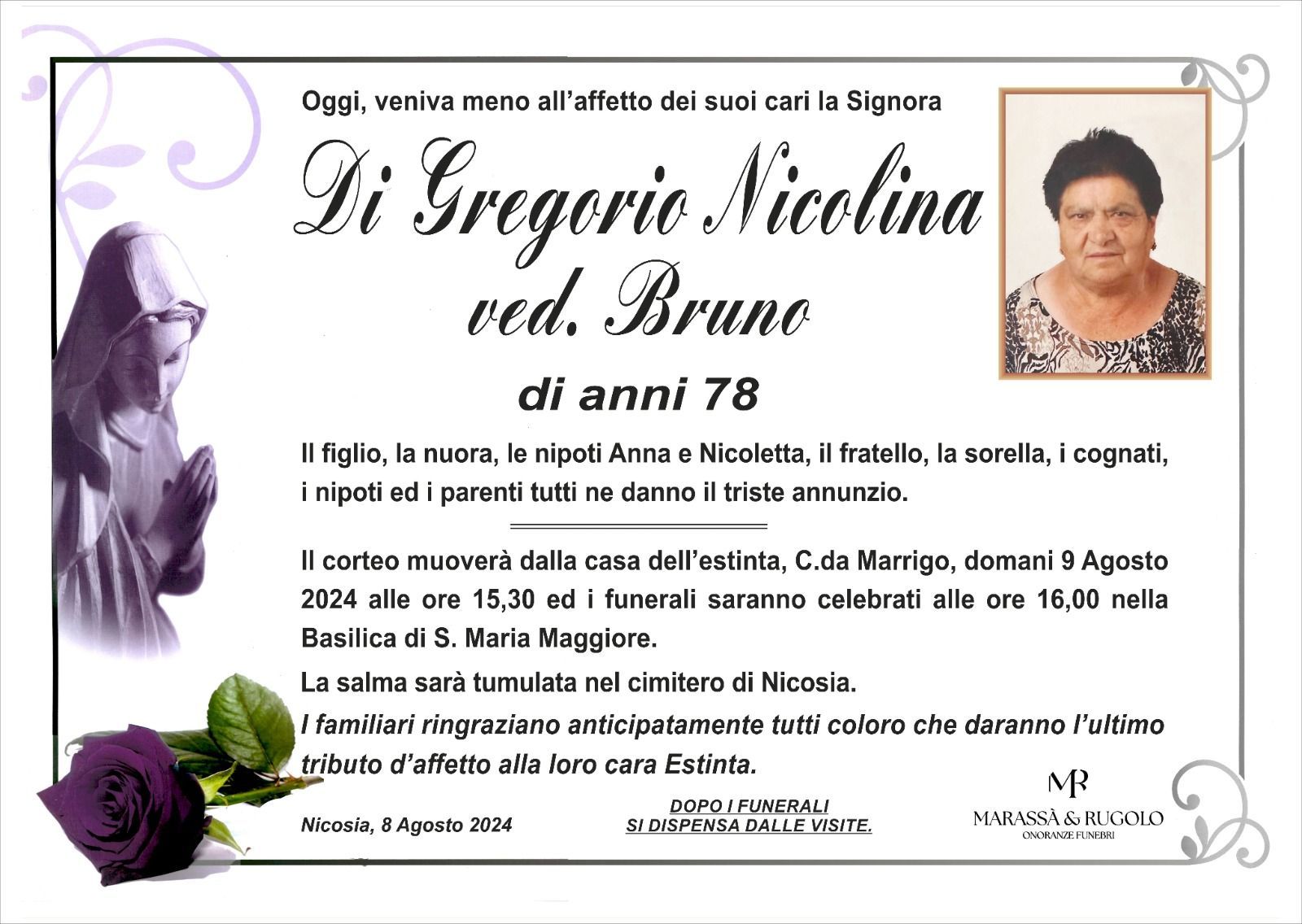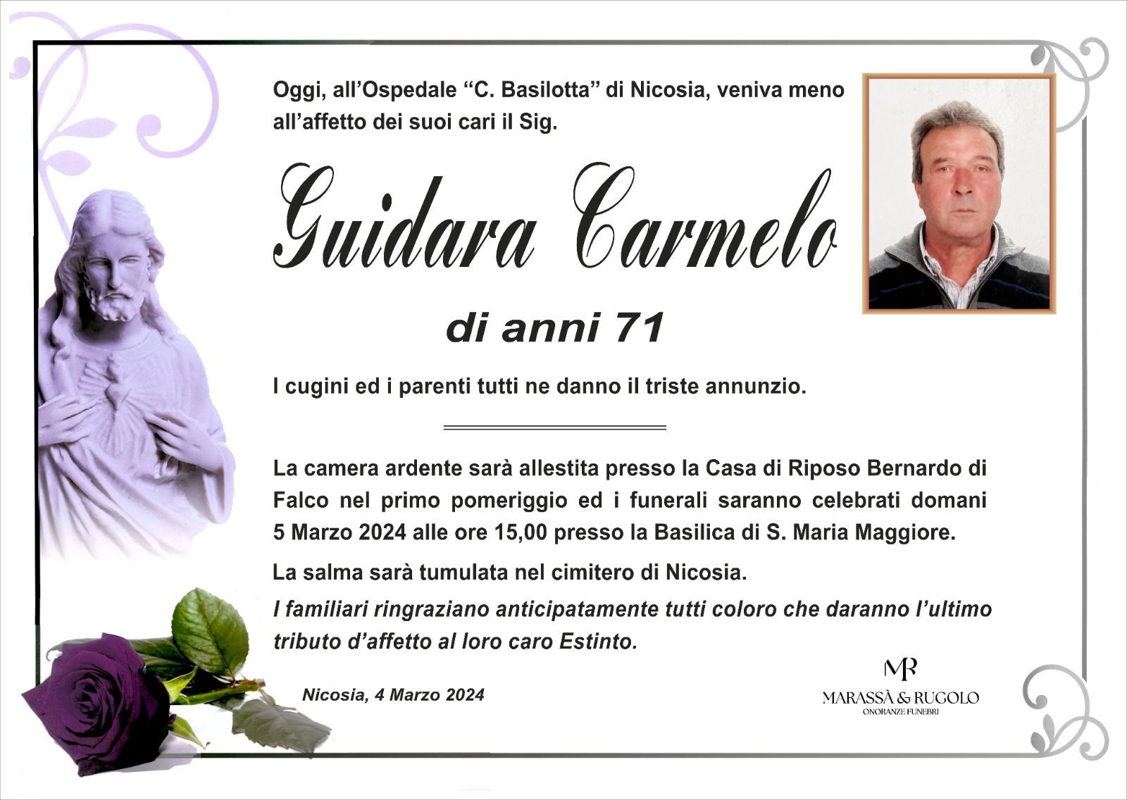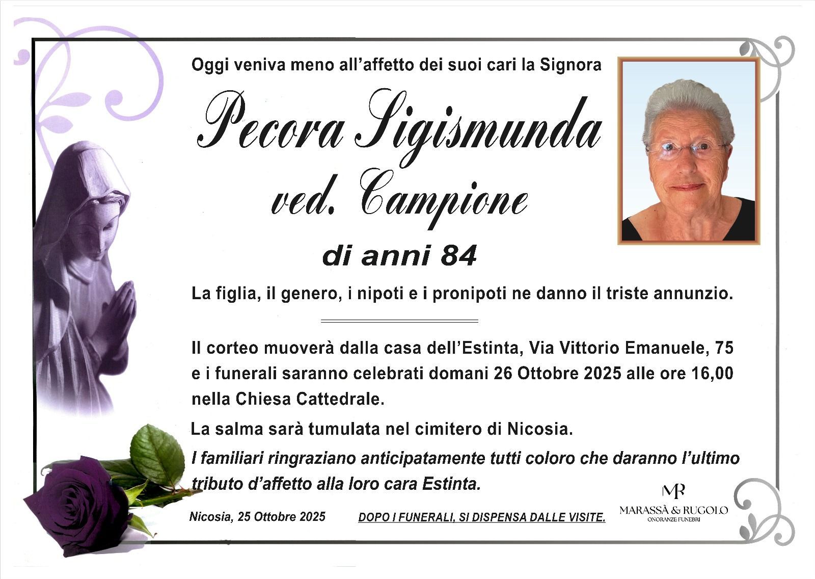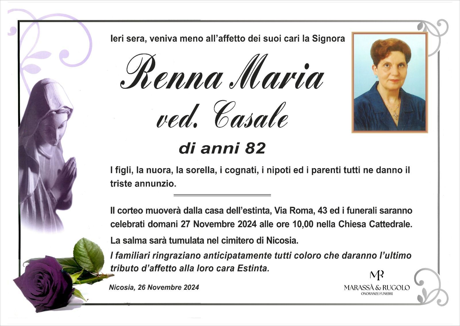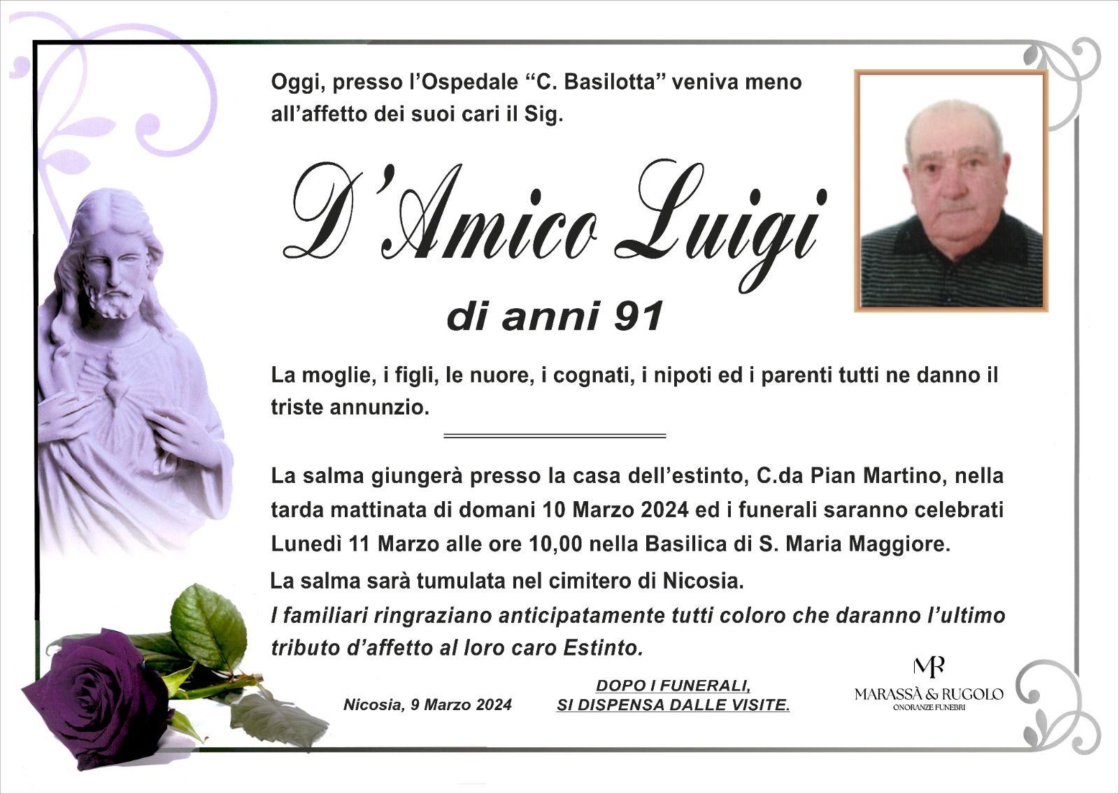 Dal 1980 l'agenzia di ONORANZE FUNEBRI MARASSA' & RUGOLO a Nicosia in provincia di Enna, effettua il disbrigo delle pratiche; trasporto delle salme in Italia e all'estero; realizzazione di articoli funerari; personalizzazione di marmi e graniti per lapidi. Ed ancora: addobbi funebri; allestimento camere ardenti; cremazione; disbrigo pratiche funerarie; pratiche cimiteriali; servizi funebri; servizi funebri completi; sigillatura casse e molto altro ancora.