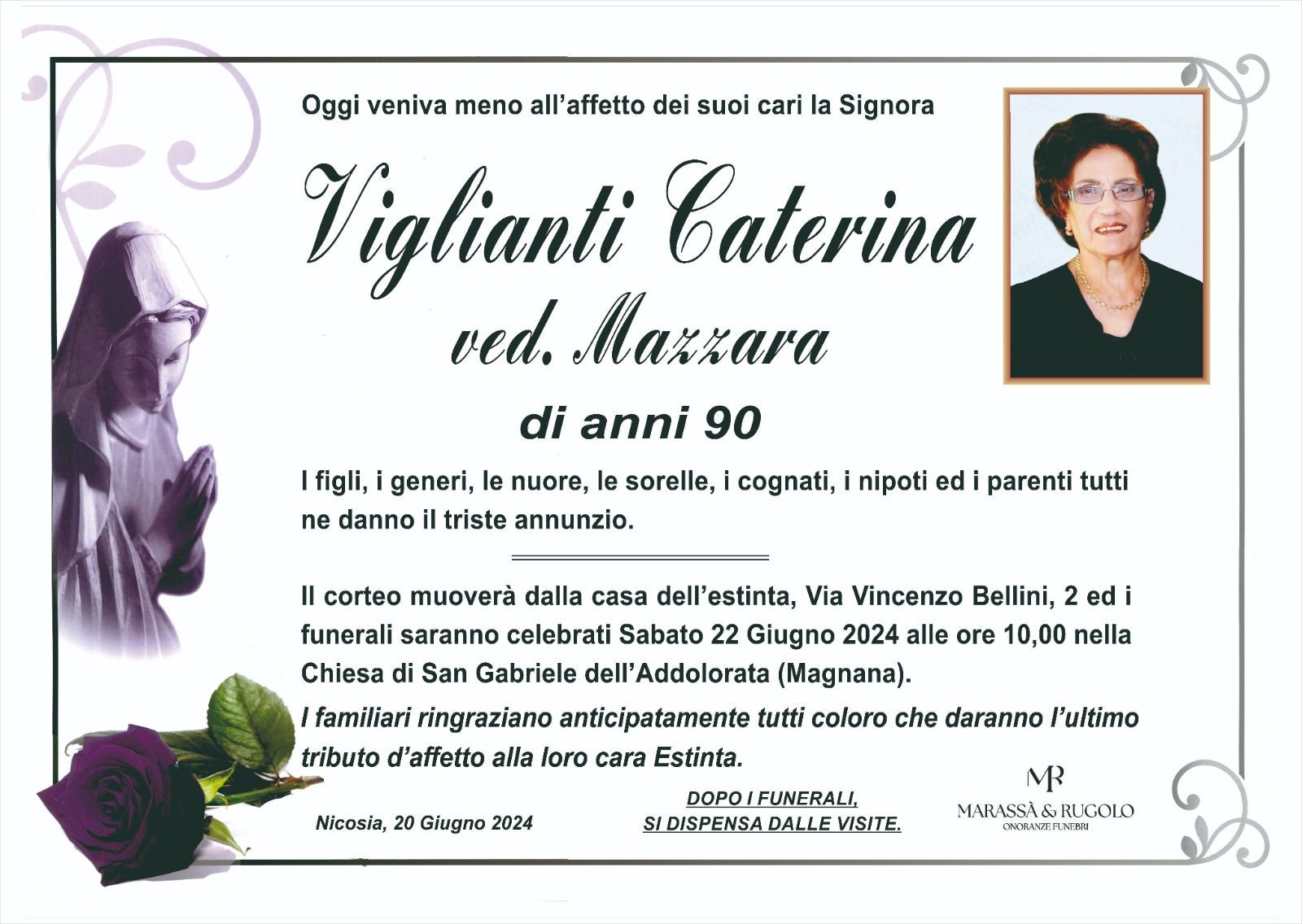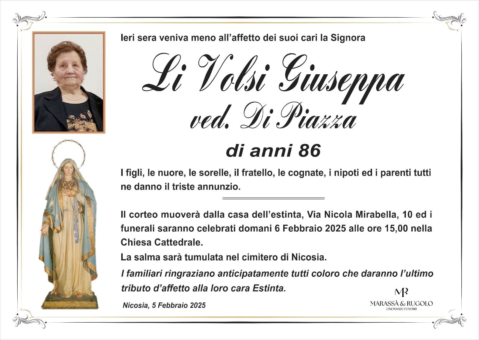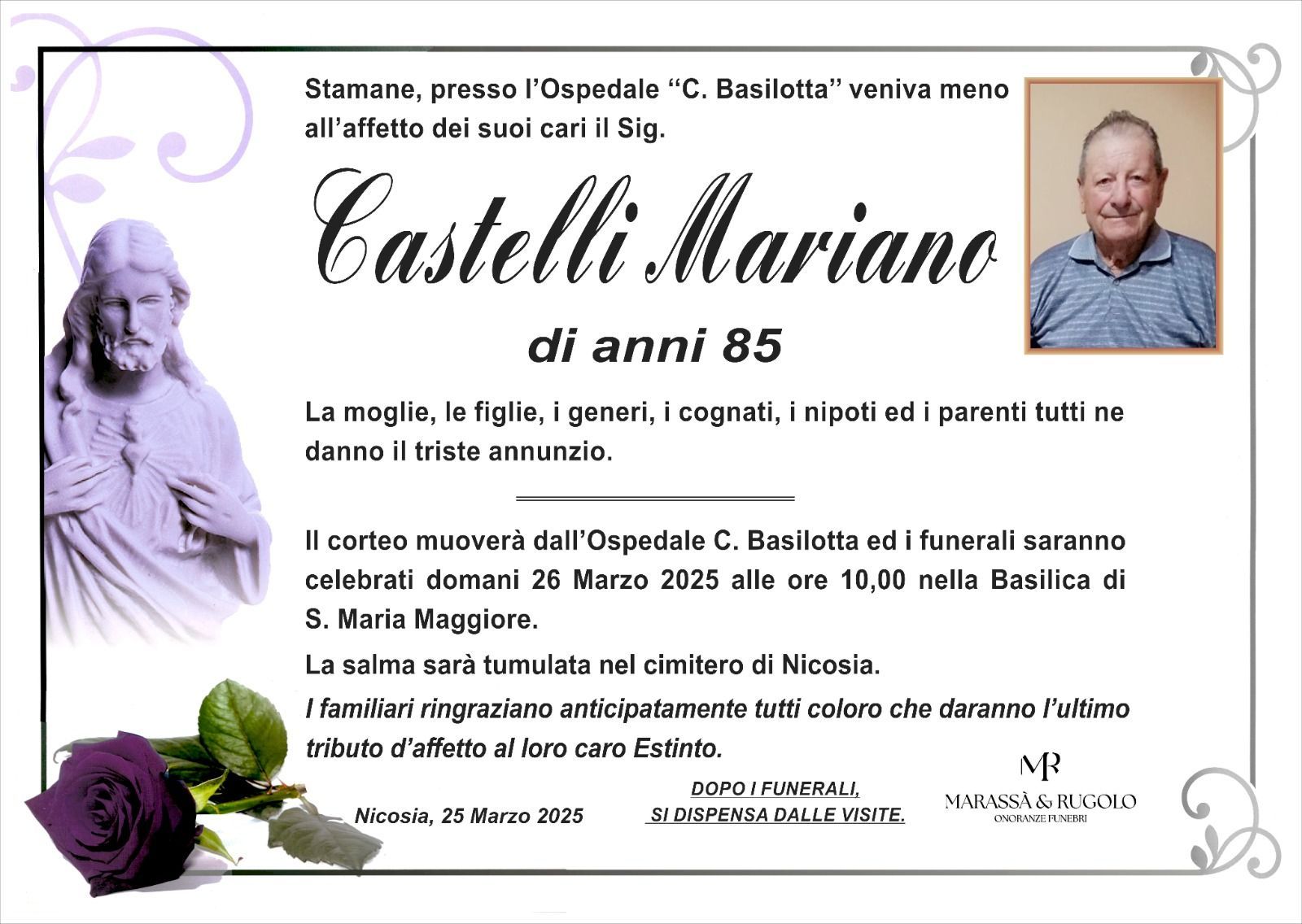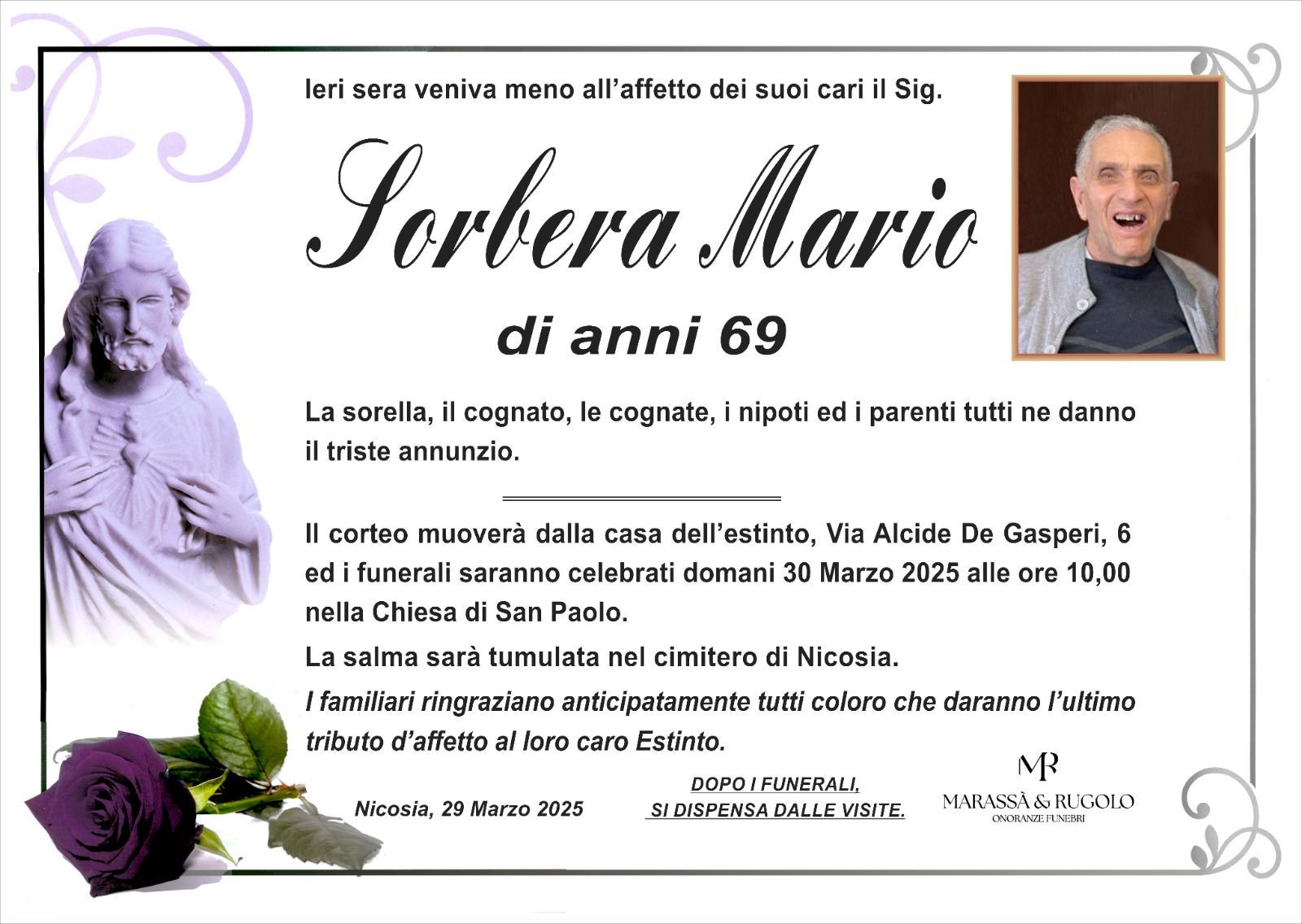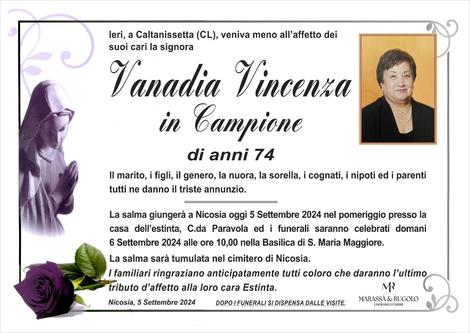Dal 1980 l'agenzia di ONORANZE FUNEBRI MARASSA' & RUGOLO a Nicosia in provincia di Enna, effettua il disbrigo delle pratiche; trasporto delle salme in Italia e all'estero; realizzazione di articoli funerari; personalizzazione di marmi e graniti per lapidi. Ed ancora: addobbi funebri; allestimento camere ardenti; cremazione; disbrigo pratiche funerarie; pratiche cimiteriali; servizi funebri; servizi funebri completi; sigillatura casse e molto altro ancora.