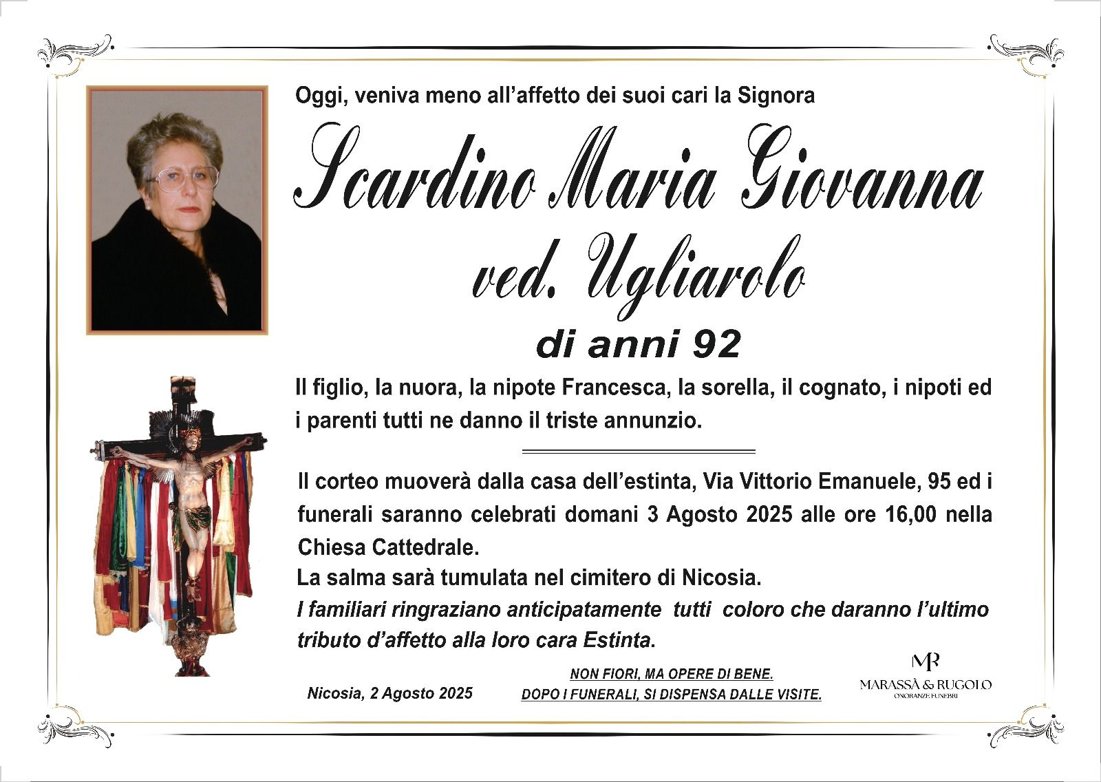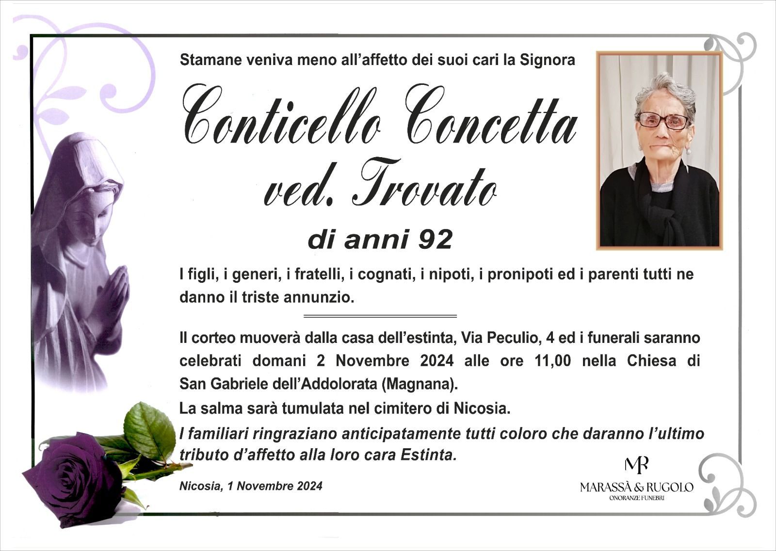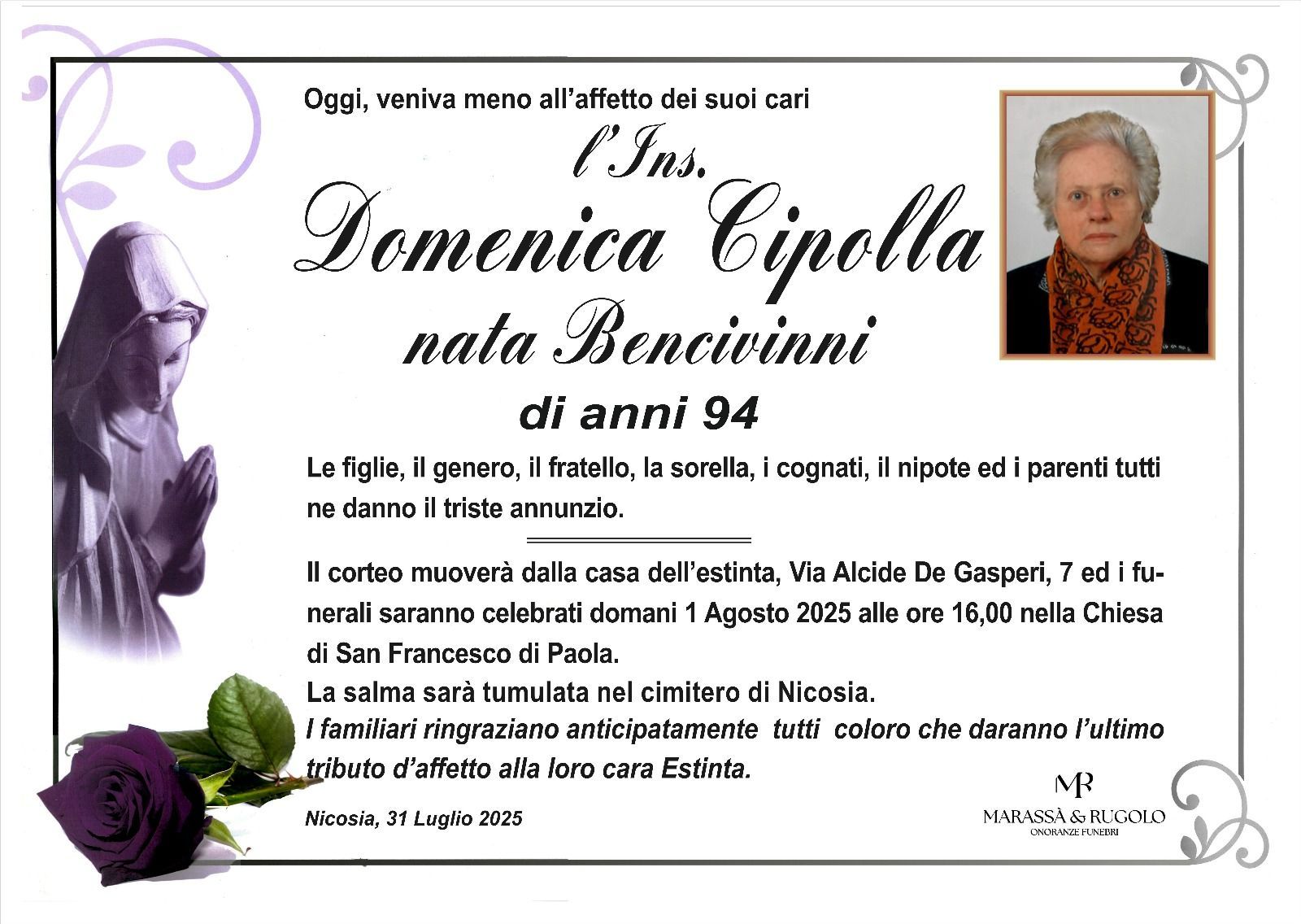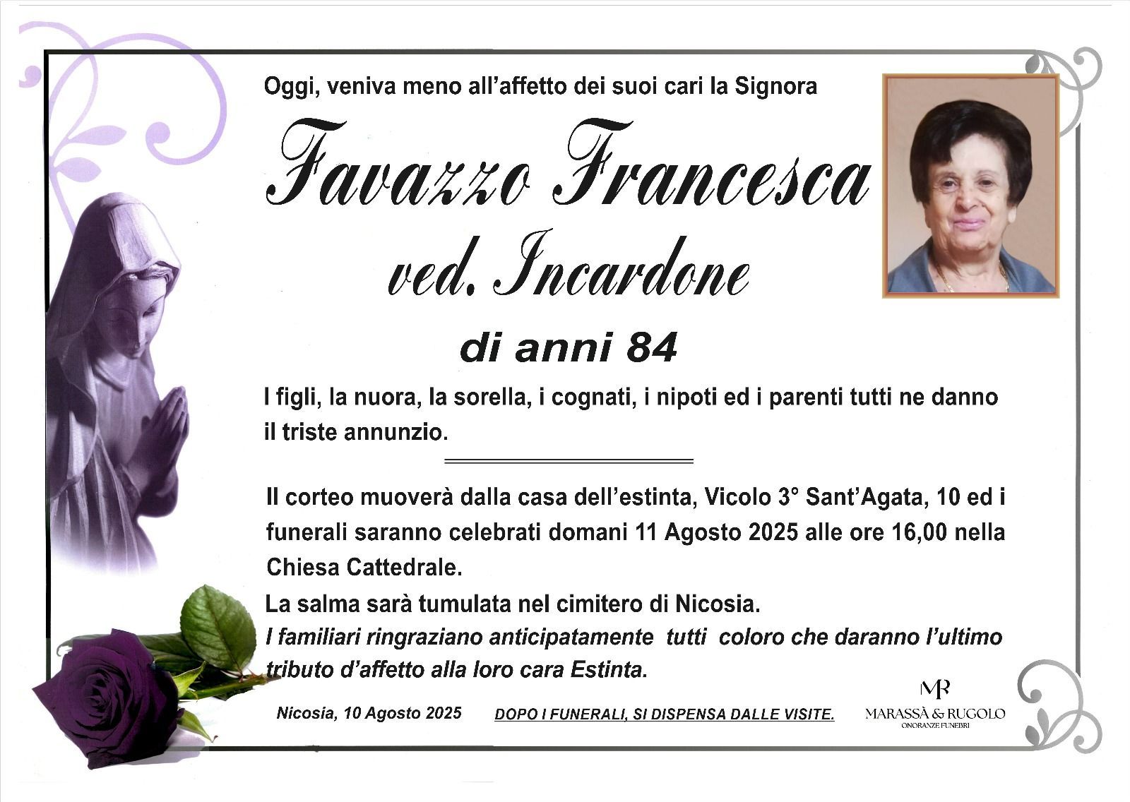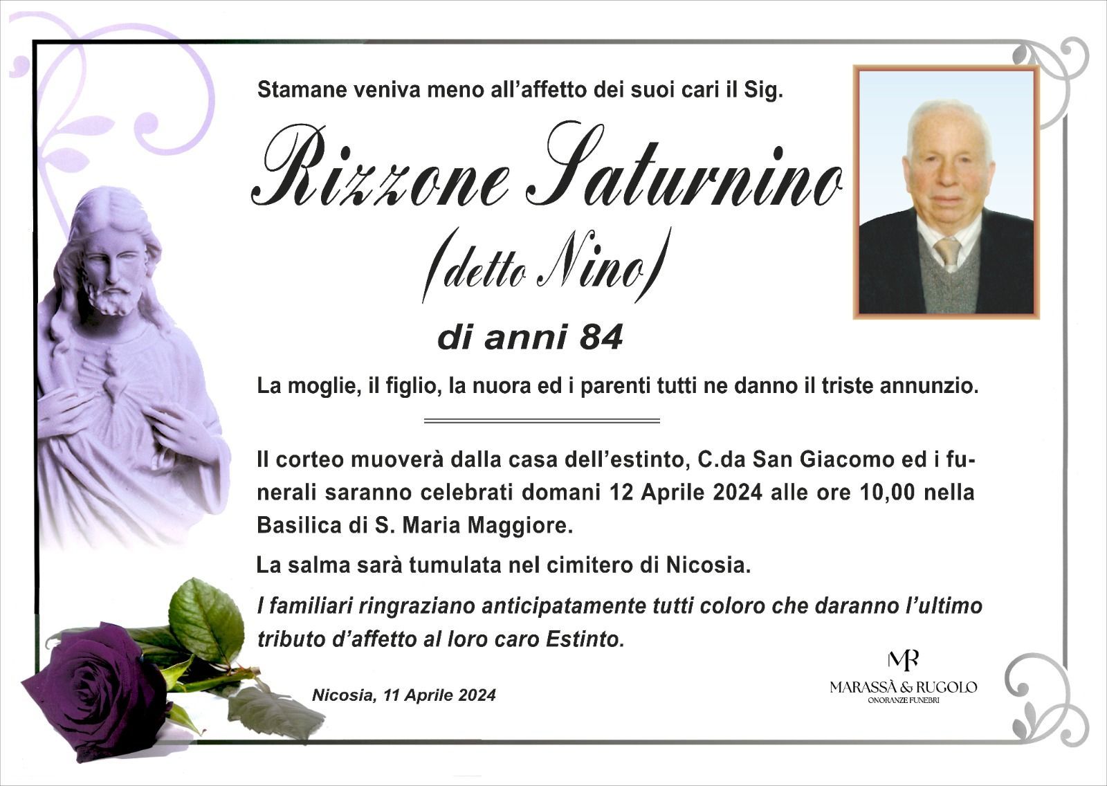 Dal 1980 l'agenzia di ONORANZE FUNEBRI MARASSA' & RUGOLO a Nicosia in provincia di Enna, effettua il disbrigo delle pratiche; trasporto delle salme in Italia e all'estero; realizzazione di articoli funerari; personalizzazione di marmi e graniti per lapidi. Ed ancora: addobbi funebri; allestimento camere ardenti; cremazione; disbrigo pratiche funerarie; pratiche cimiteriali; servizi funebri; servizi funebri completi; sigillatura casse e molto altro ancora.