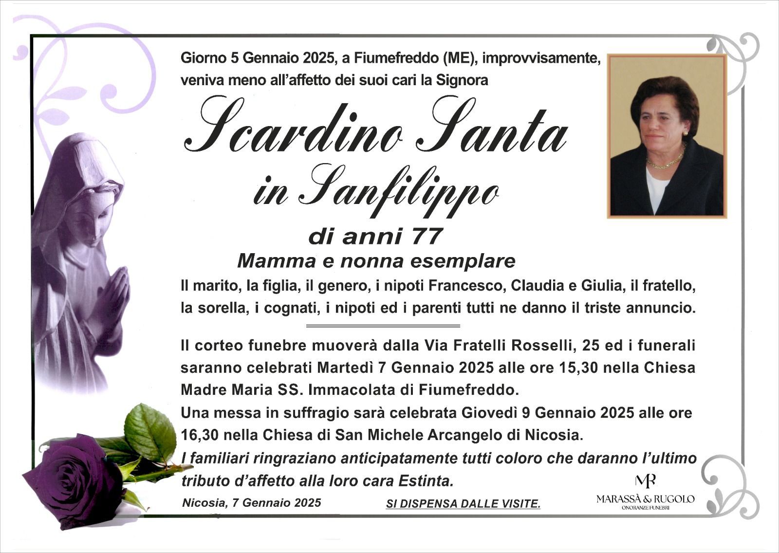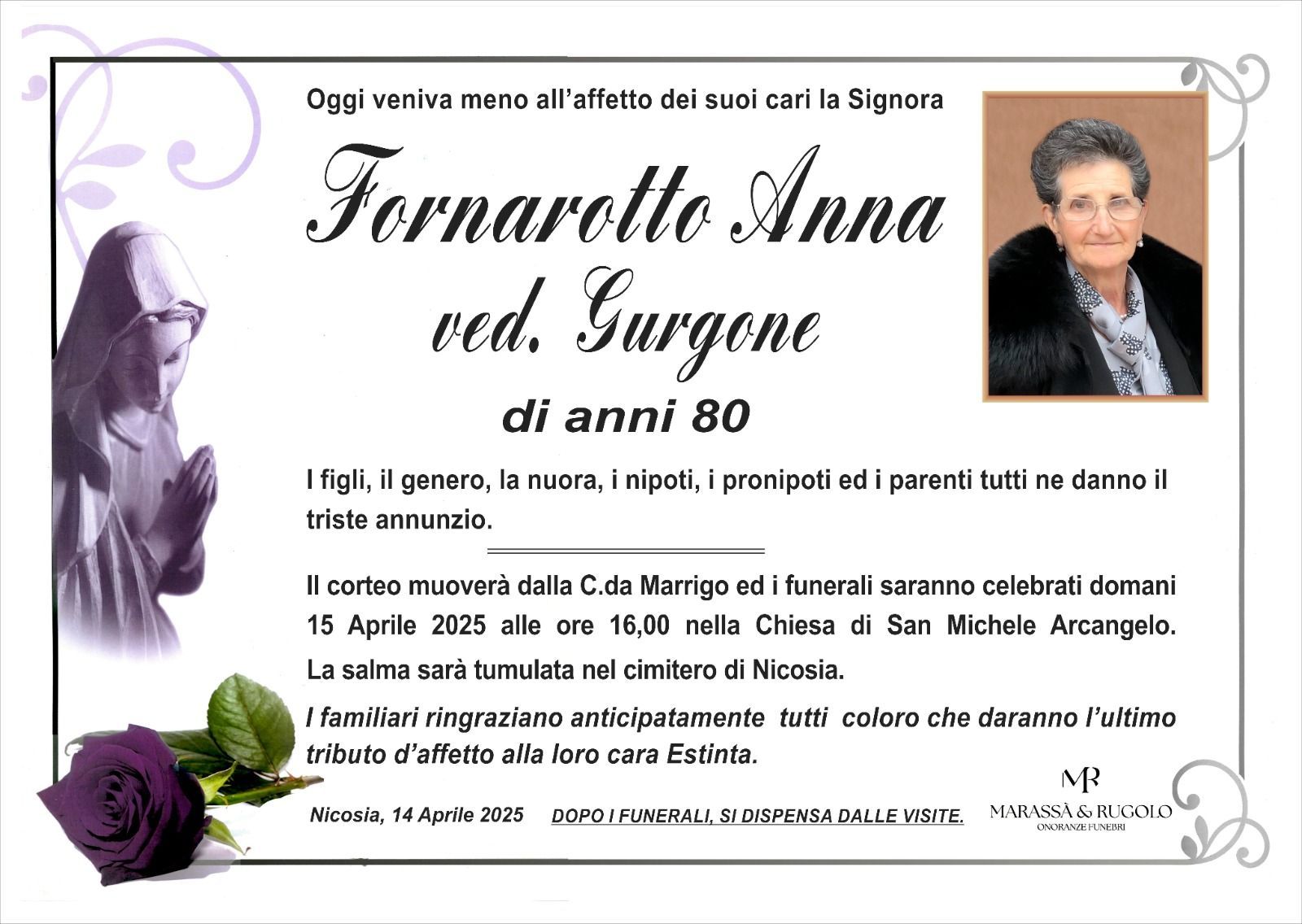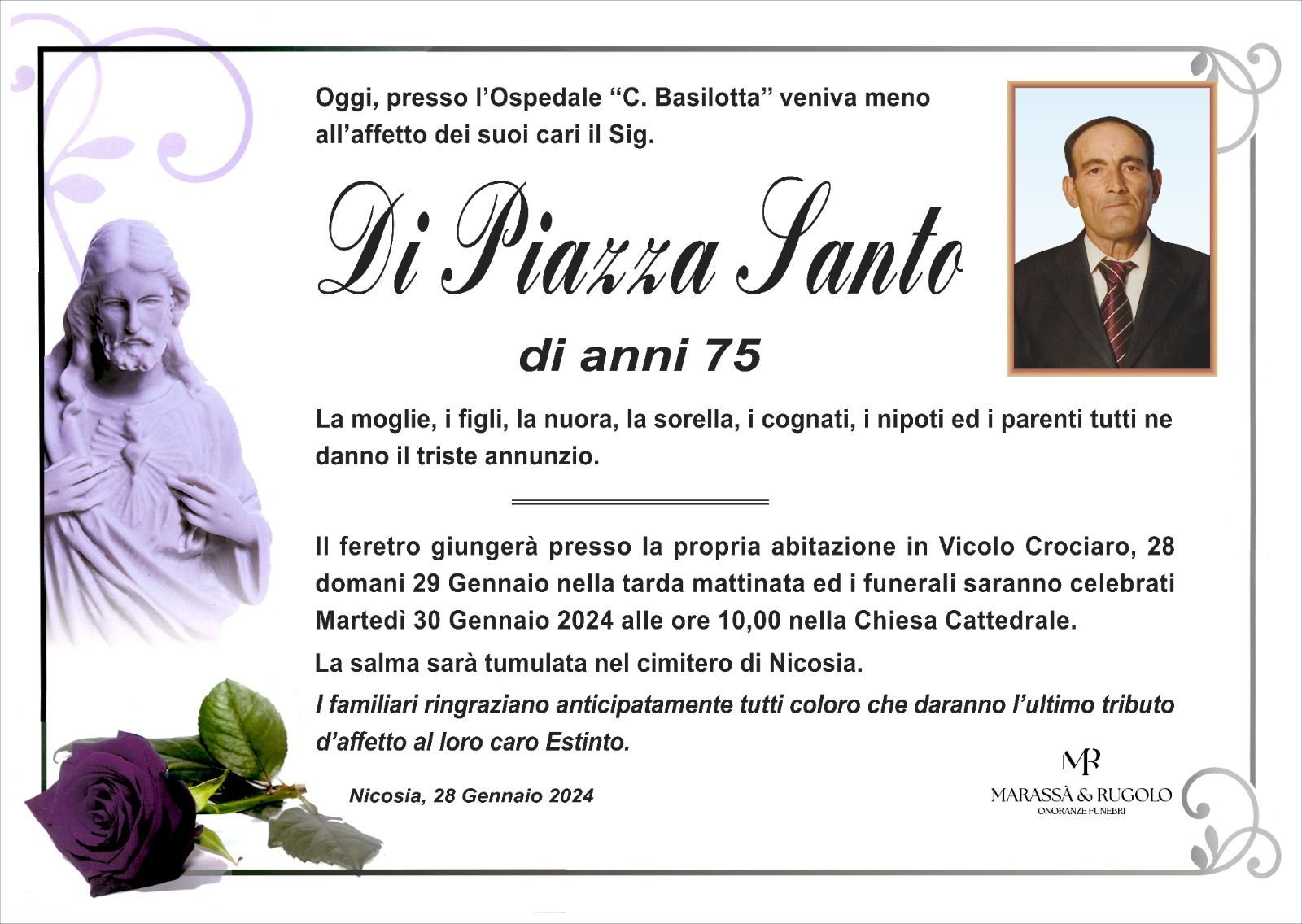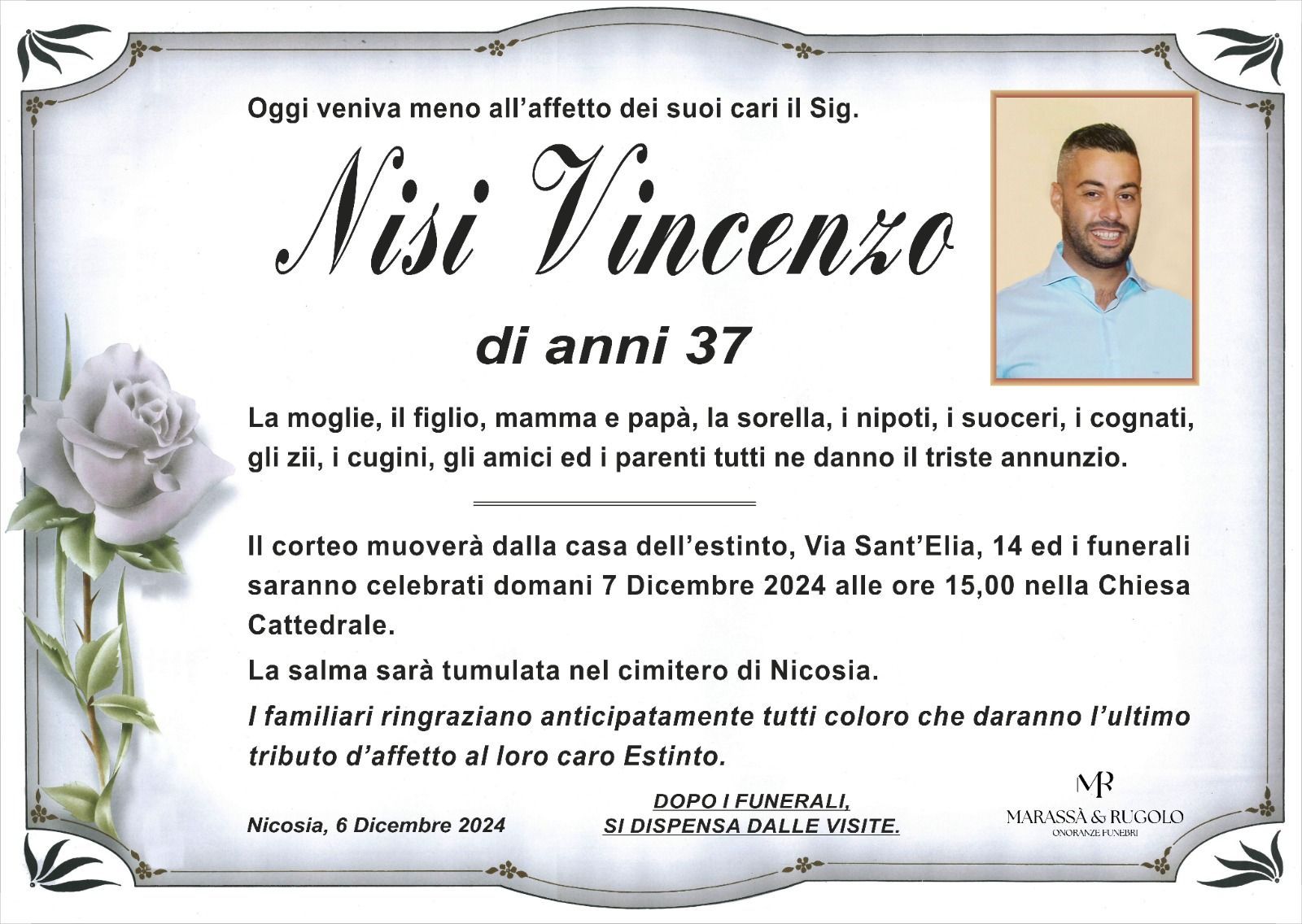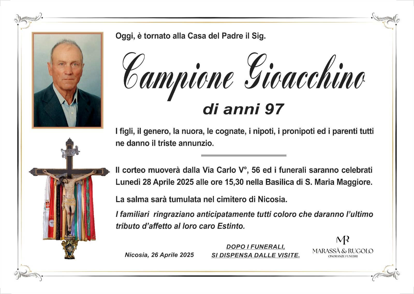 Dal 1980 l'agenzia di ONORANZE FUNEBRI MARASSA' & RUGOLO a Nicosia in provincia di Enna, effettua il disbrigo delle pratiche; trasporto delle salme in Italia e all'estero; realizzazione di articoli funerari; personalizzazione di marmi e graniti per lapidi. Ed ancora: addobbi funebri; allestimento camere ardenti; cremazione; disbrigo pratiche funerarie; pratiche cimiteriali; servizi funebri; servizi funebri completi; sigillatura casse e molto altro ancora.