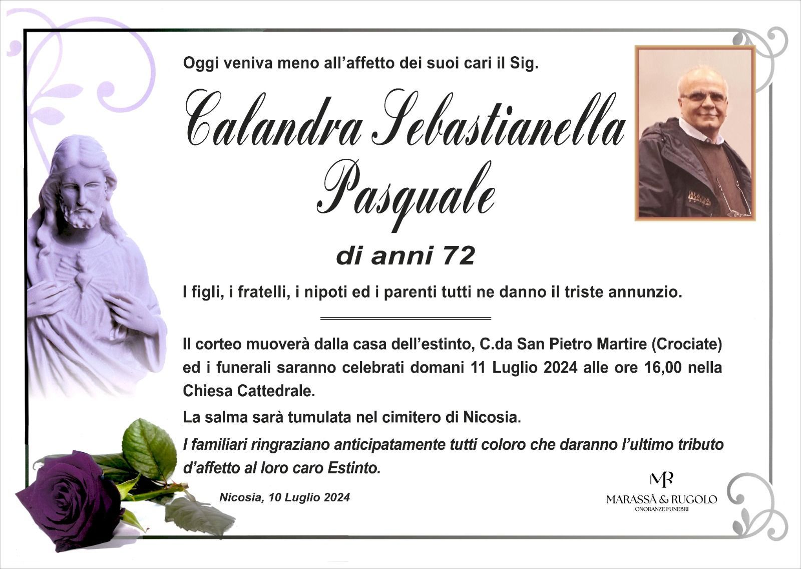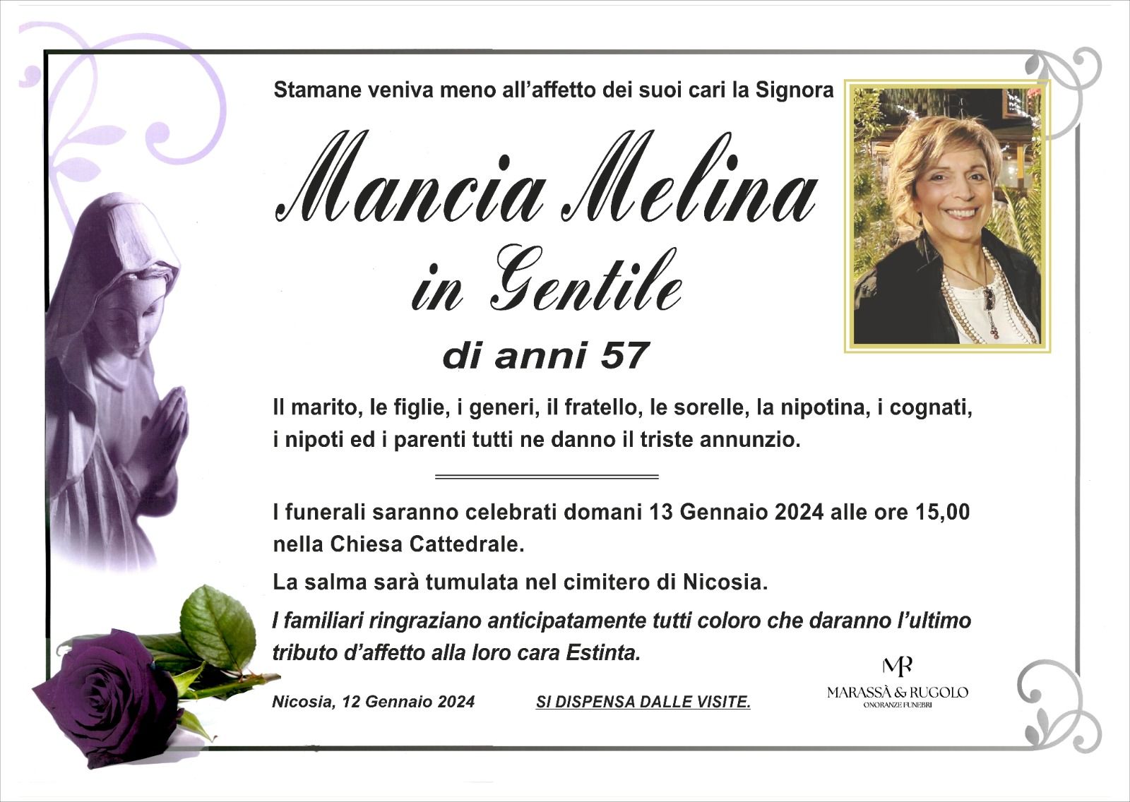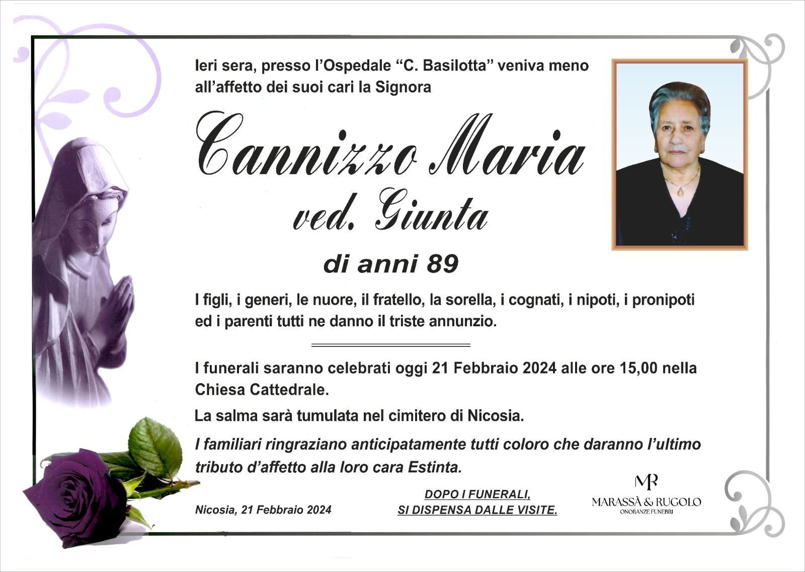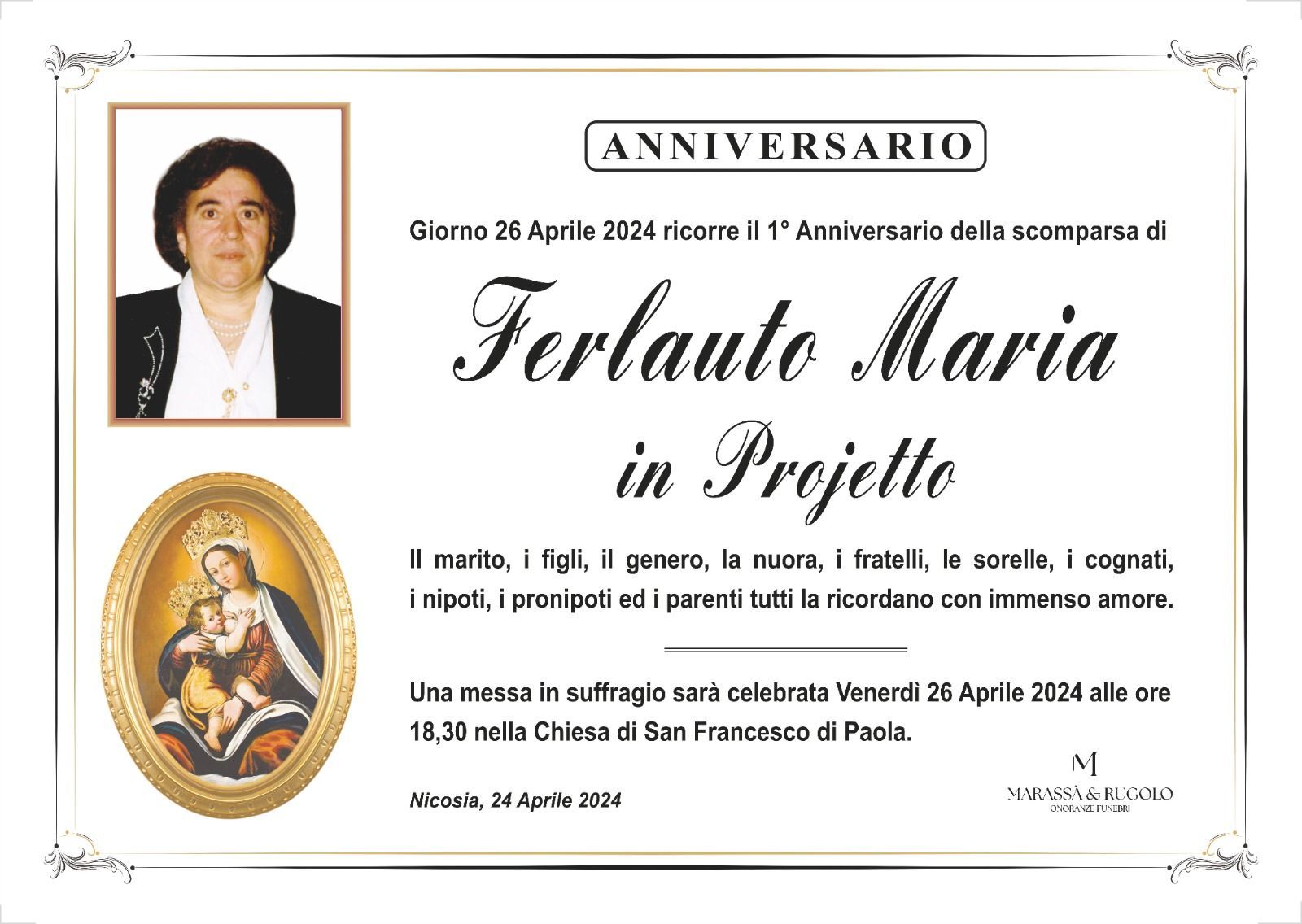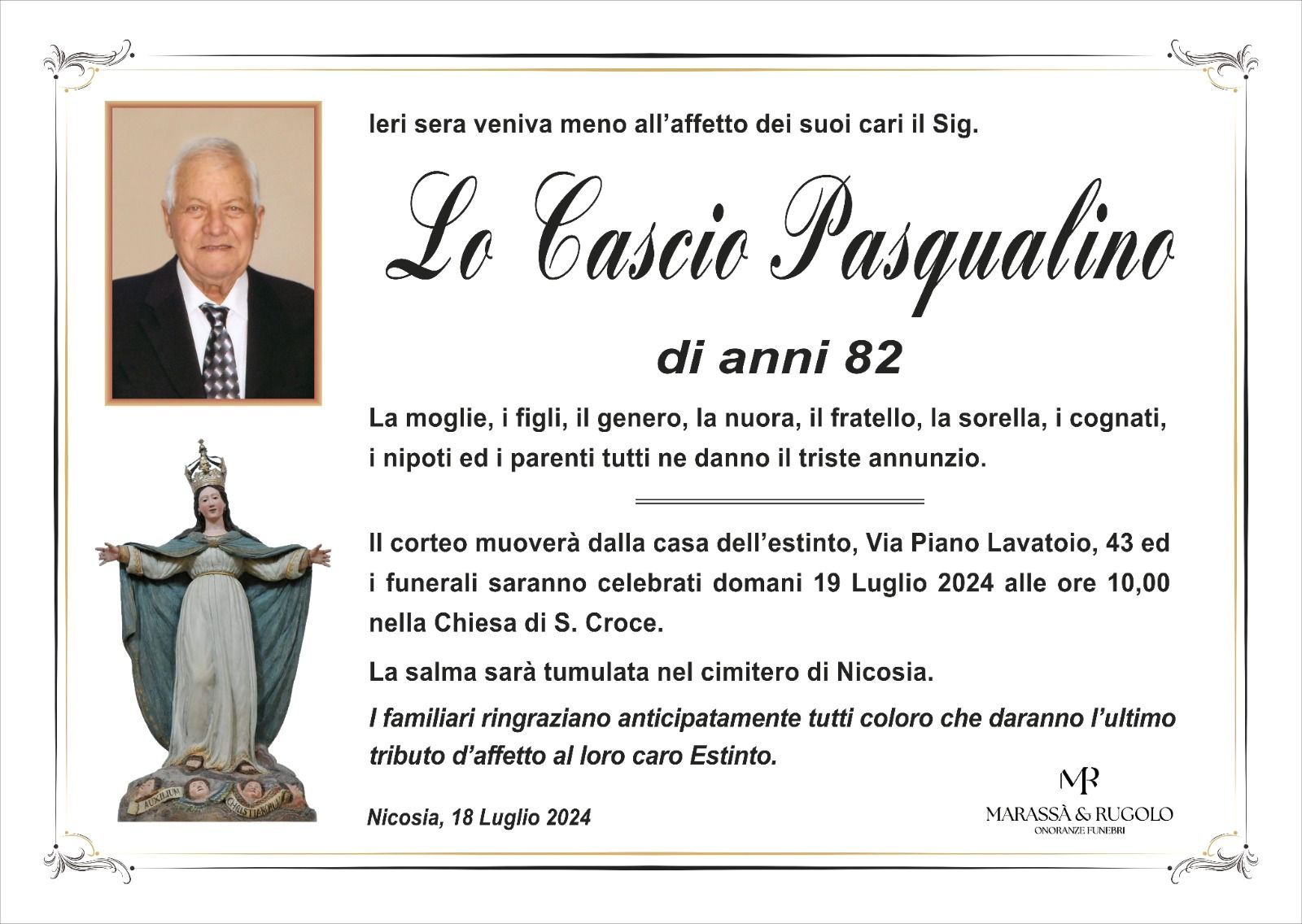 Dal 1980 l'agenzia di ONORANZE FUNEBRI MARASSA' & RUGOLO a Nicosia in provincia di Enna, effettua il disbrigo delle pratiche; trasporto delle salme in Italia e all'estero; realizzazione di articoli funerari; personalizzazione di marmi e graniti per lapidi. Ed ancora: addobbi funebri; allestimento camere ardenti; cremazione; disbrigo pratiche funerarie; pratiche cimiteriali; servizi funebri; servizi funebri completi; sigillatura casse e molto altro ancora.