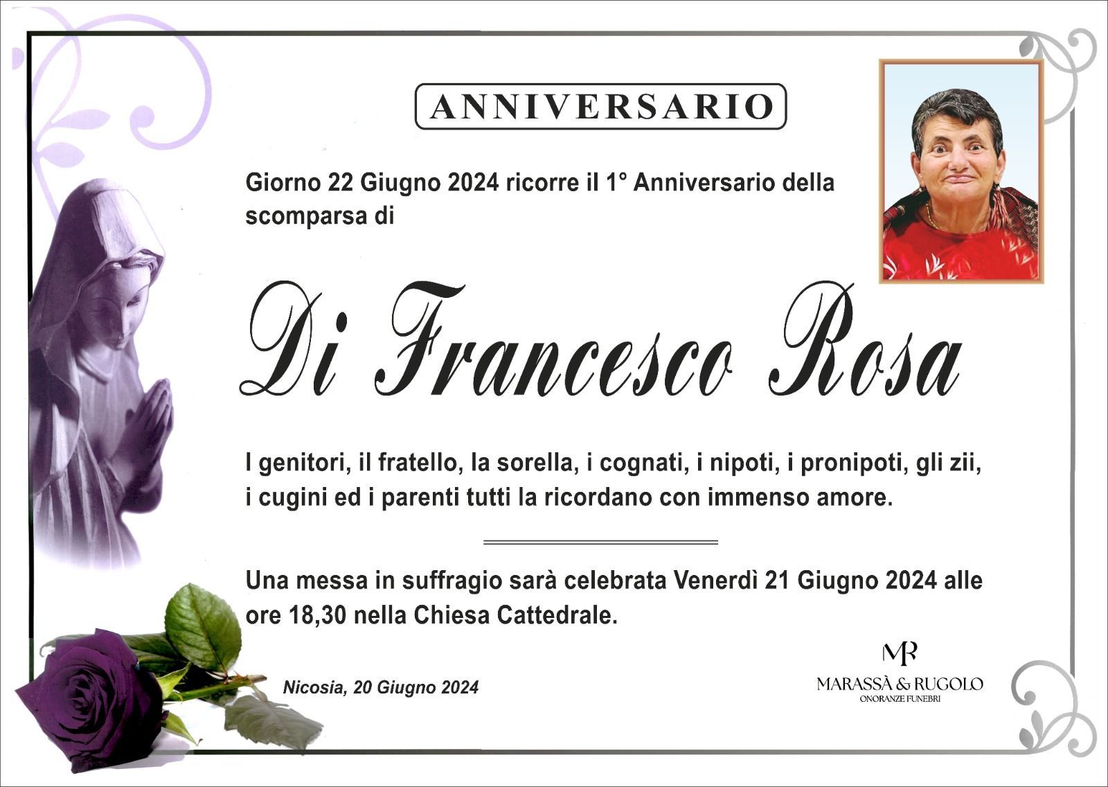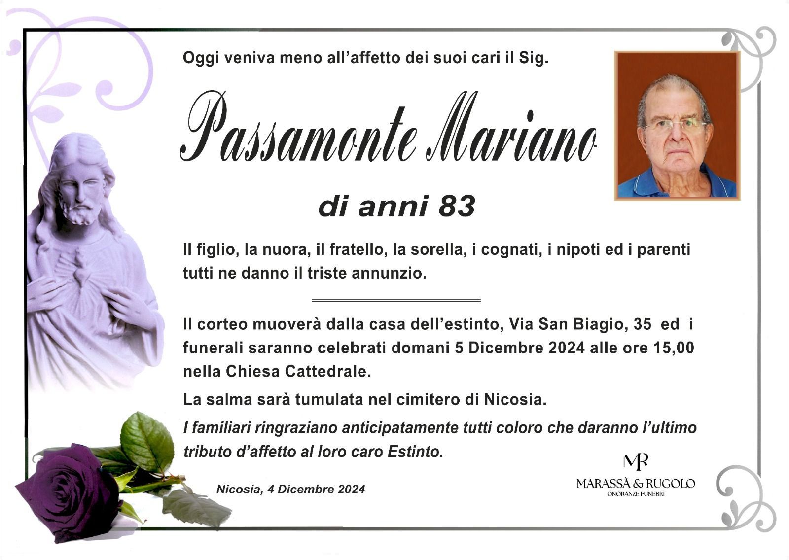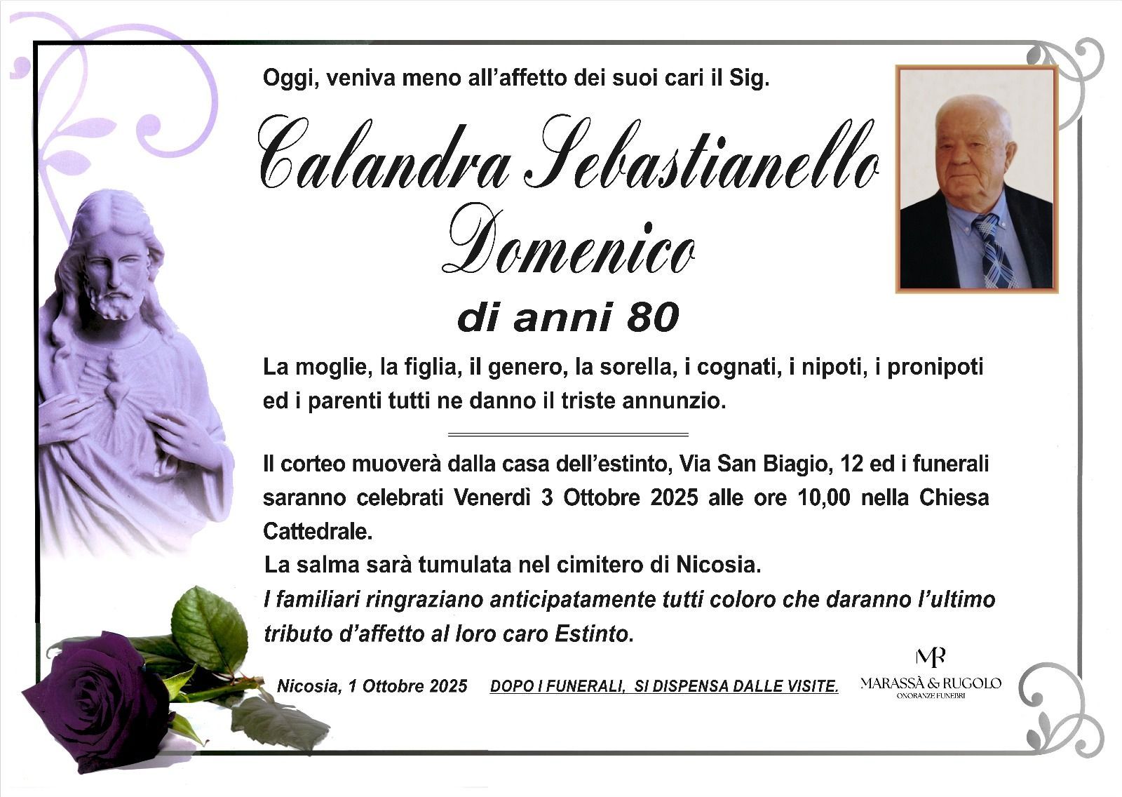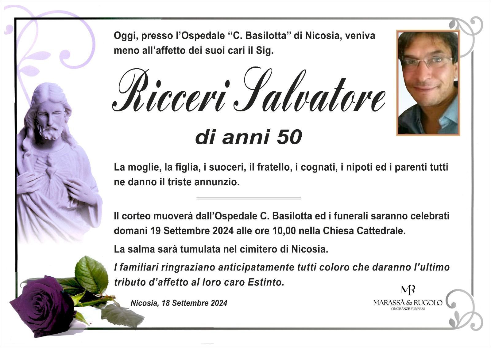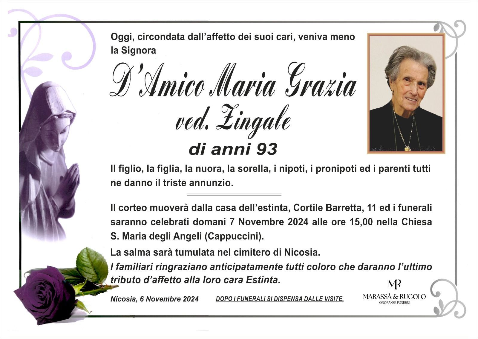 Dal 1980 l'agenzia di ONORANZE FUNEBRI MARASSA' & RUGOLO a Nicosia in provincia di Enna, effettua il disbrigo delle pratiche; trasporto delle salme in Italia e all'estero; realizzazione di articoli funerari; personalizzazione di marmi e graniti per lapidi. Ed ancora: addobbi funebri; allestimento camere ardenti; cremazione; disbrigo pratiche funerarie; pratiche cimiteriali; servizi funebri; servizi funebri completi; sigillatura casse e molto altro ancora.