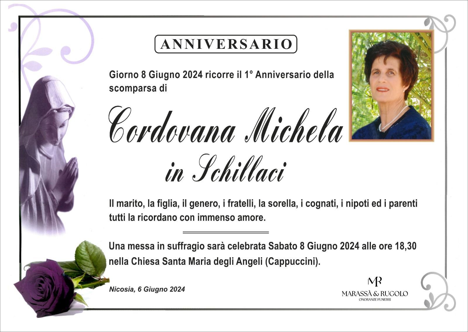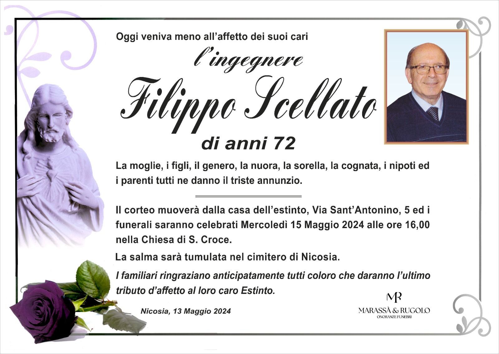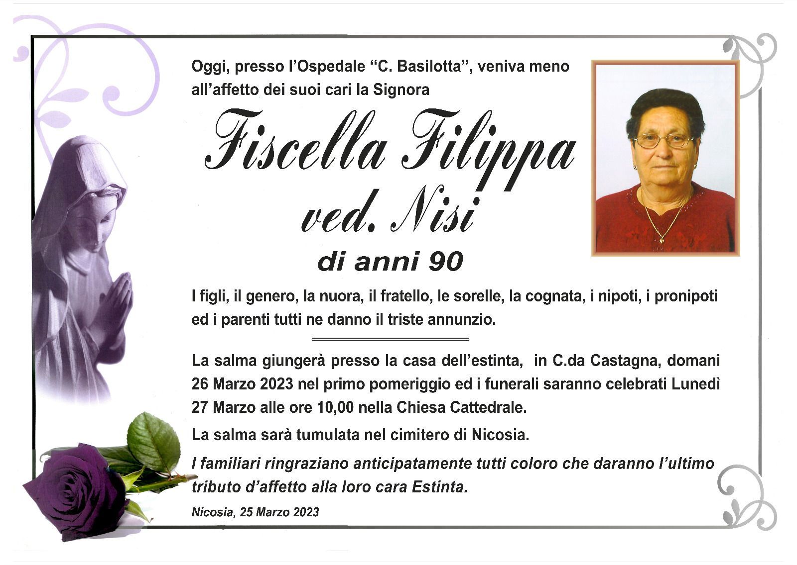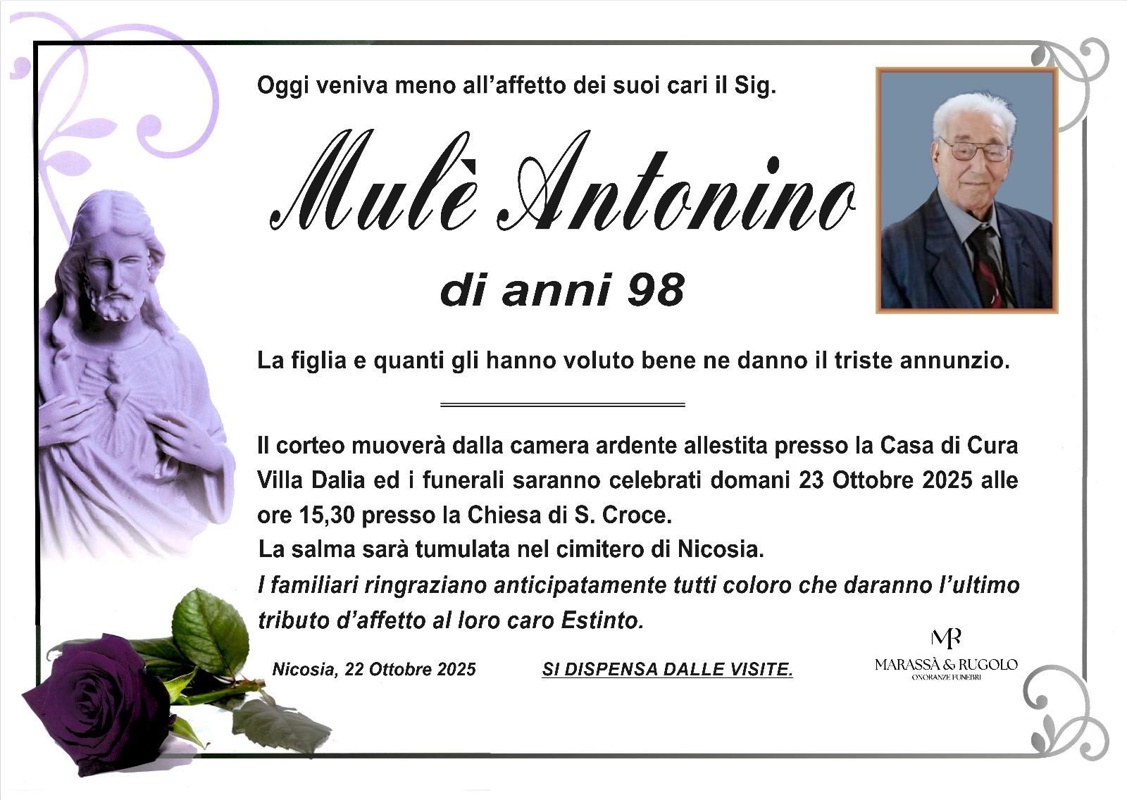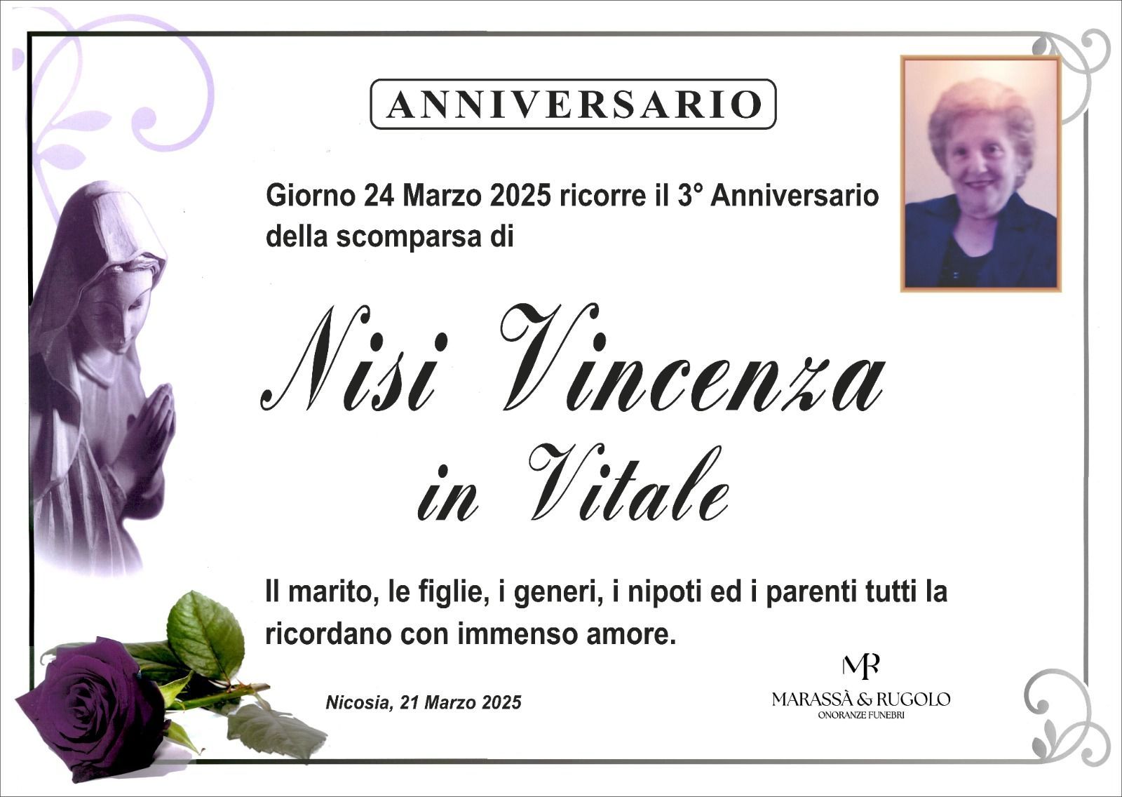 Dal 1980 l'agenzia di ONORANZE FUNEBRI MARASSA' & RUGOLO a Nicosia in provincia di Enna, effettua il disbrigo delle pratiche; trasporto delle salme in Italia e all'estero; realizzazione di articoli funerari; personalizzazione di marmi e graniti per lapidi. Ed ancora: addobbi funebri; allestimento camere ardenti; cremazione; disbrigo pratiche funerarie; pratiche cimiteriali; servizi funebri; servizi funebri completi; sigillatura casse e molto altro ancora.