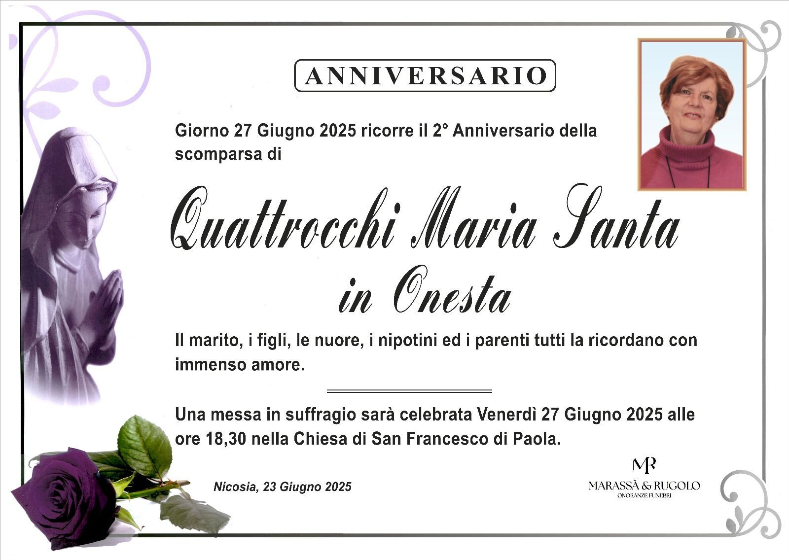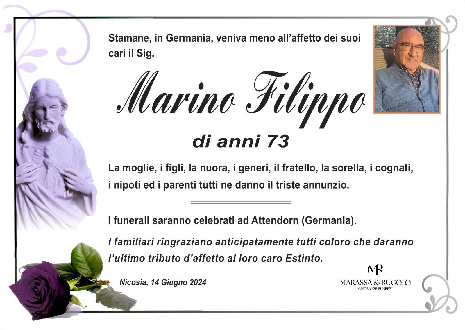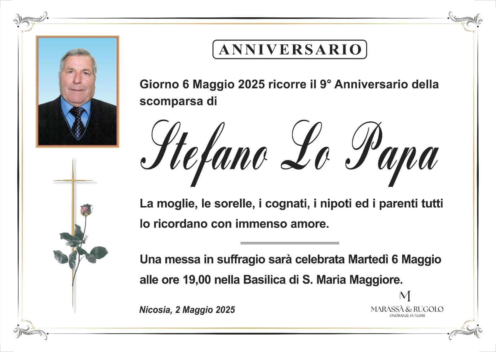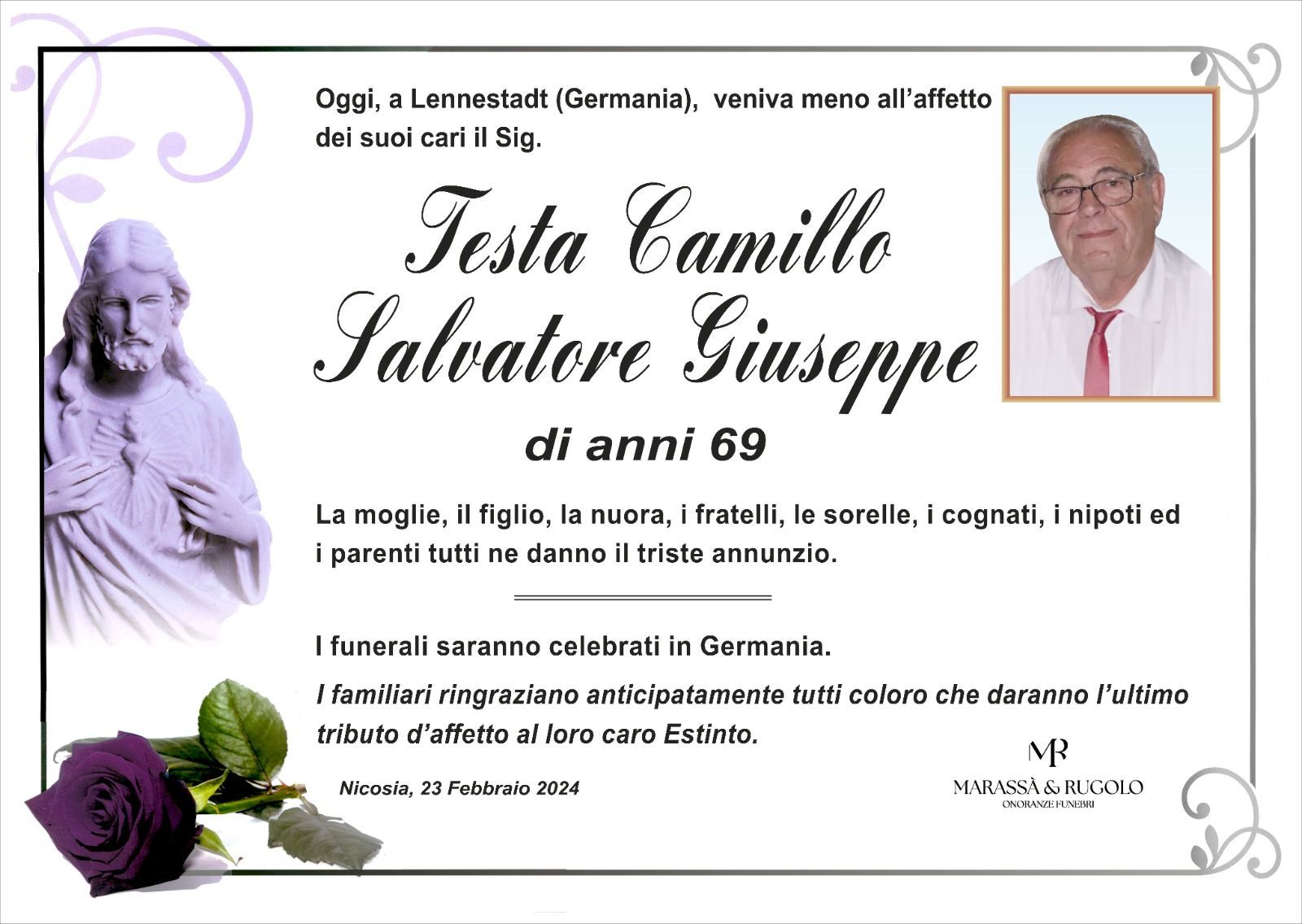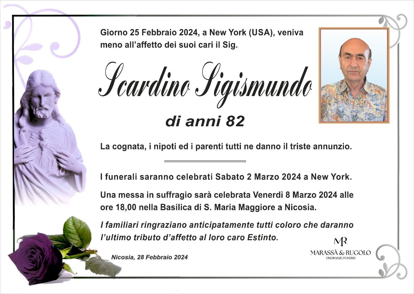 Dal 1980 l'agenzia di ONORANZE FUNEBRI MARASSA' & RUGOLO a Nicosia in provincia di Enna, effettua il disbrigo delle pratiche; trasporto delle salme in Italia e all'estero; realizzazione di articoli funerari; personalizzazione di marmi e graniti per lapidi. Ed ancora: addobbi funebri; allestimento camere ardenti; cremazione; disbrigo pratiche funerarie; pratiche cimiteriali; servizi funebri; servizi funebri completi; sigillatura casse e molto altro ancora.