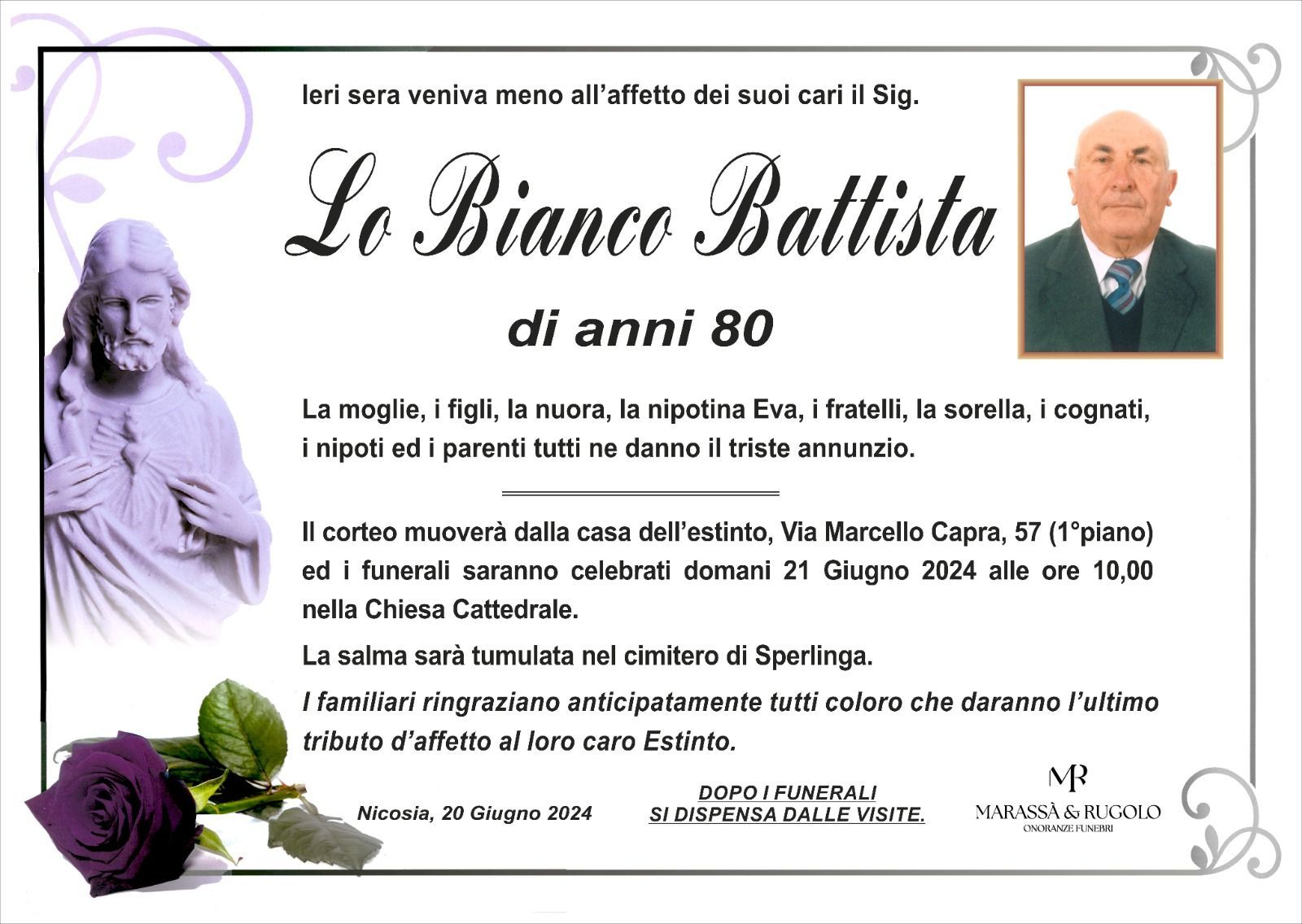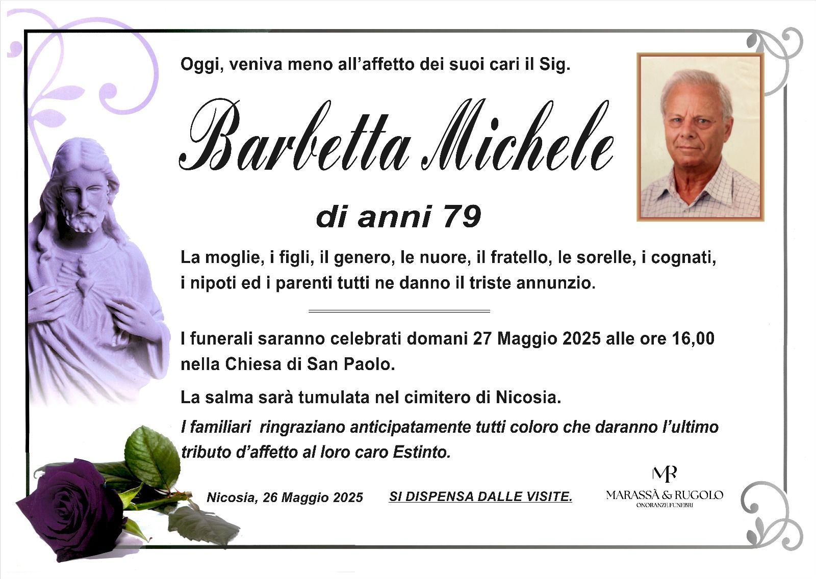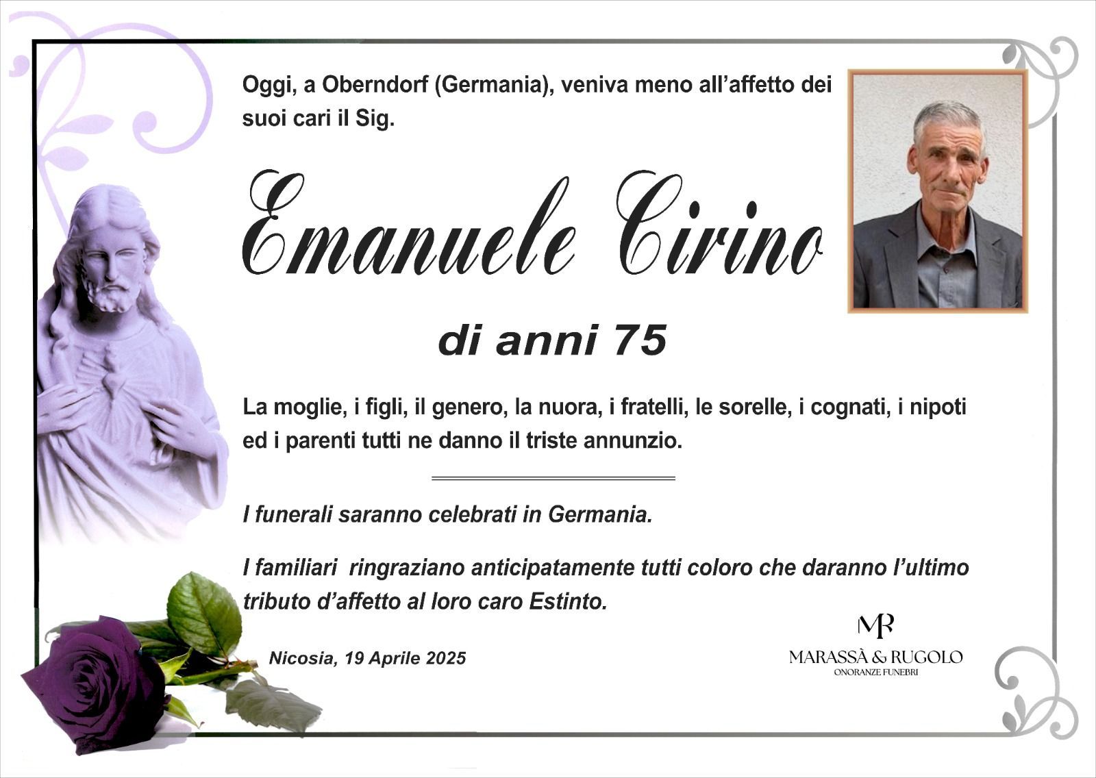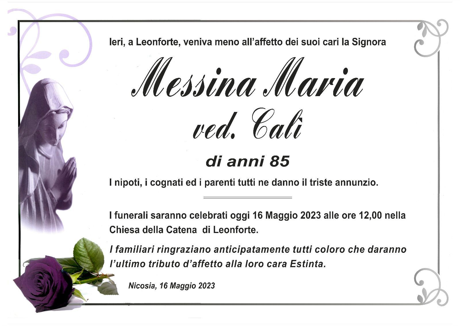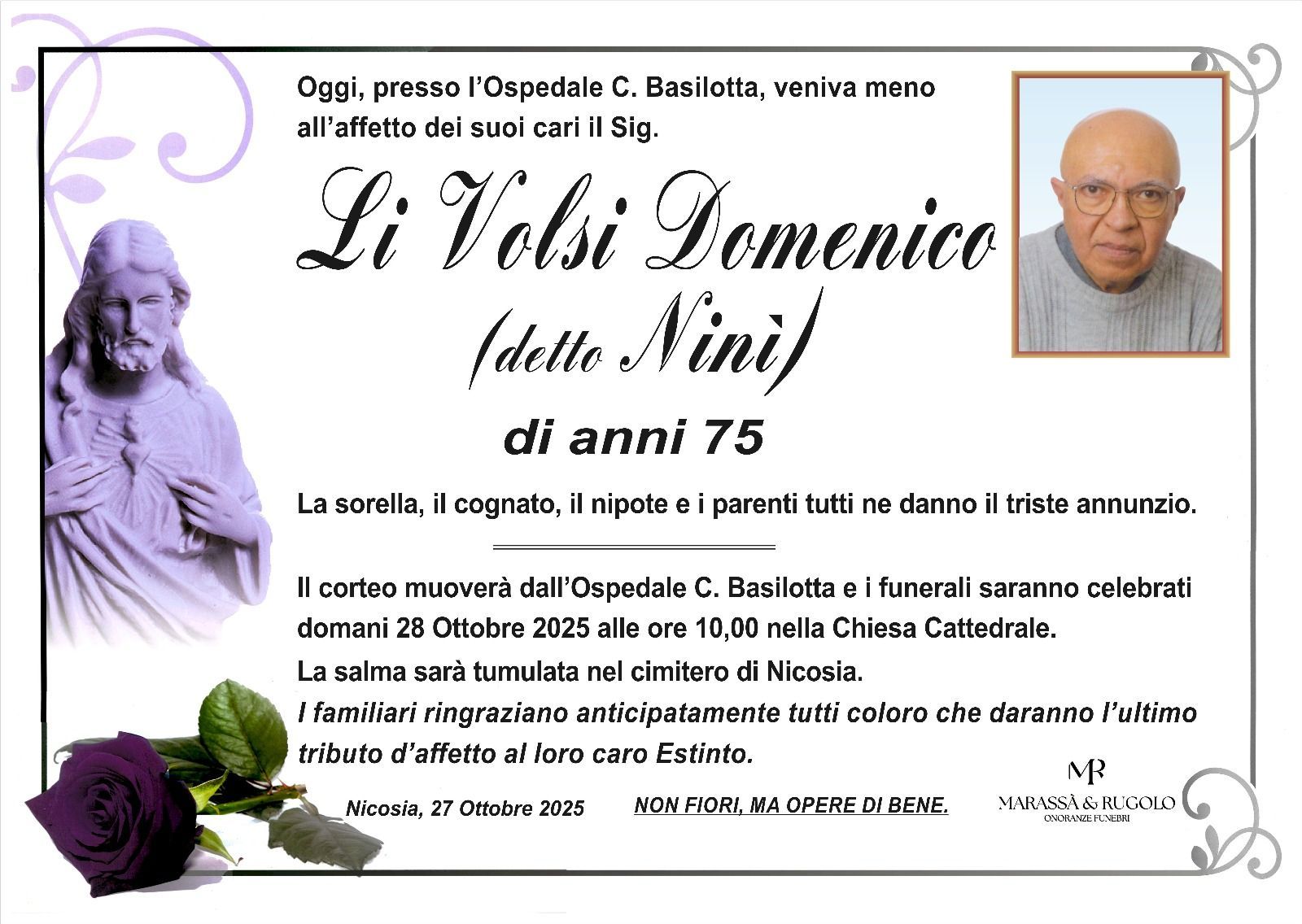Dal 1980 l'agenzia di ONORANZE FUNEBRI MARASSA' & RUGOLO a Nicosia in provincia di Enna, effettua il disbrigo delle pratiche; trasporto delle salme in Italia e all'estero; realizzazione di articoli funerari; personalizzazione di marmi e graniti per lapidi. Ed ancora: addobbi funebri; allestimento camere ardenti; cremazione; disbrigo pratiche funerarie; pratiche cimiteriali; servizi funebri; servizi funebri completi; sigillatura casse e molto altro ancora.