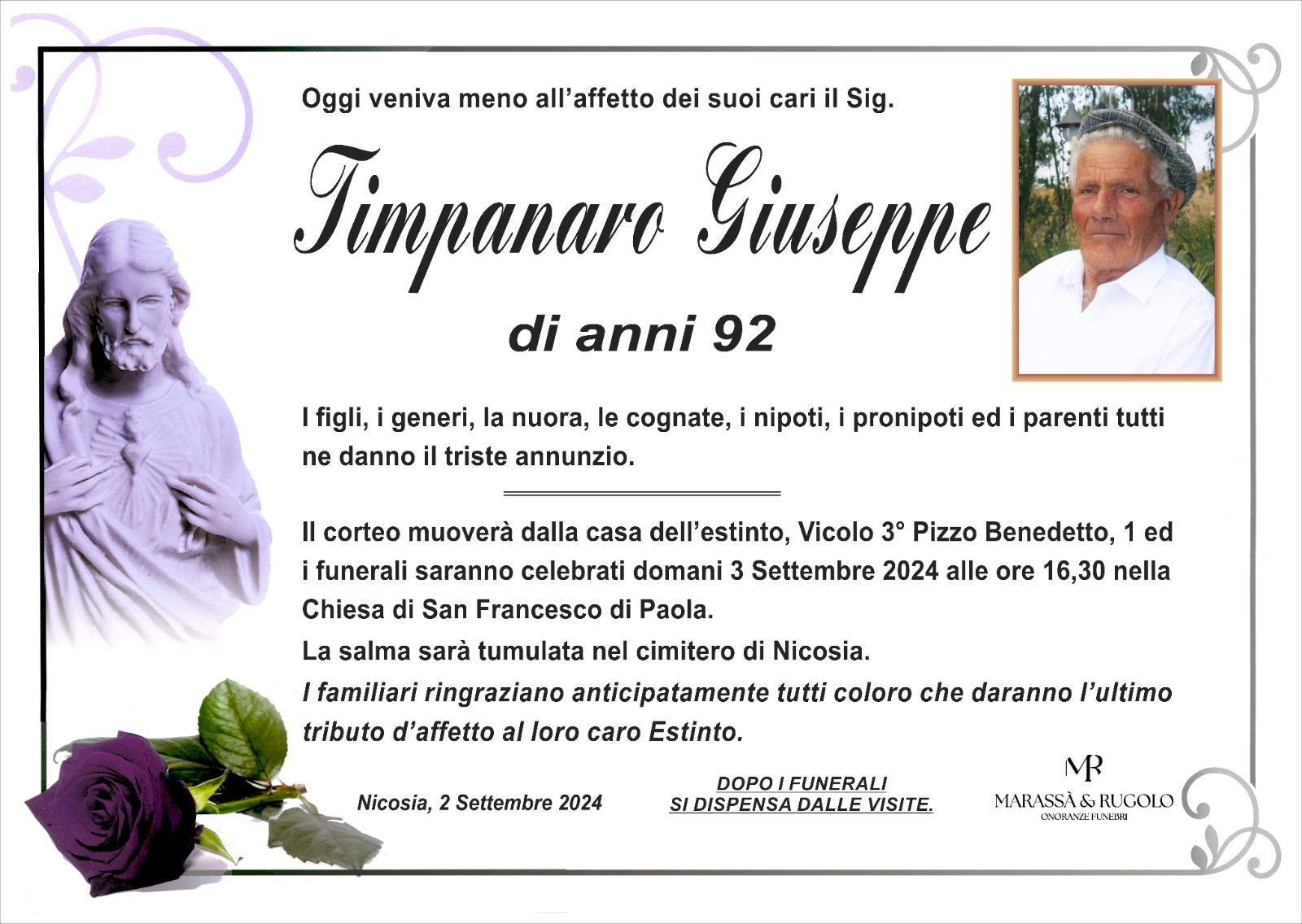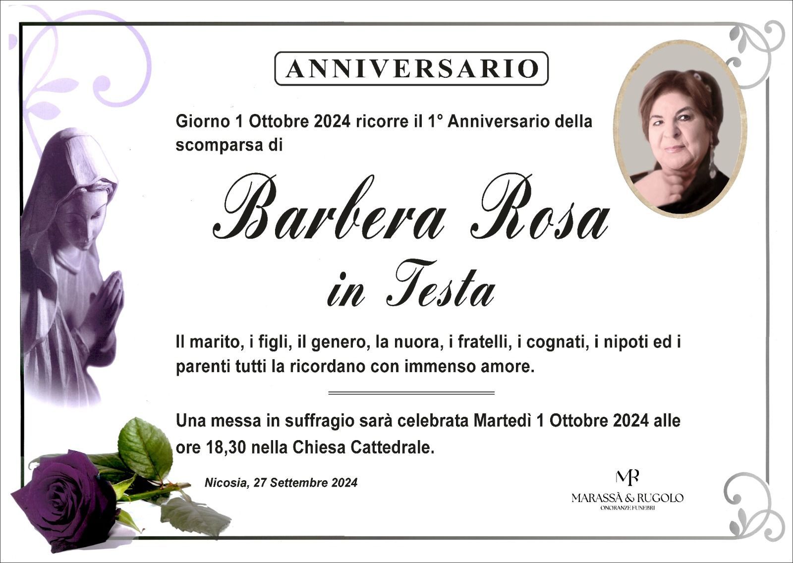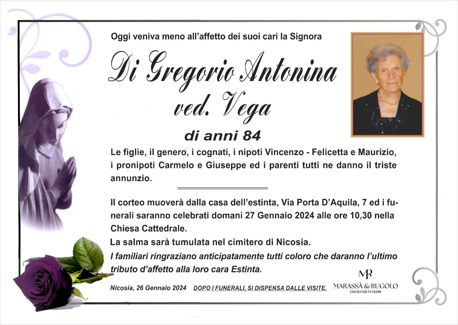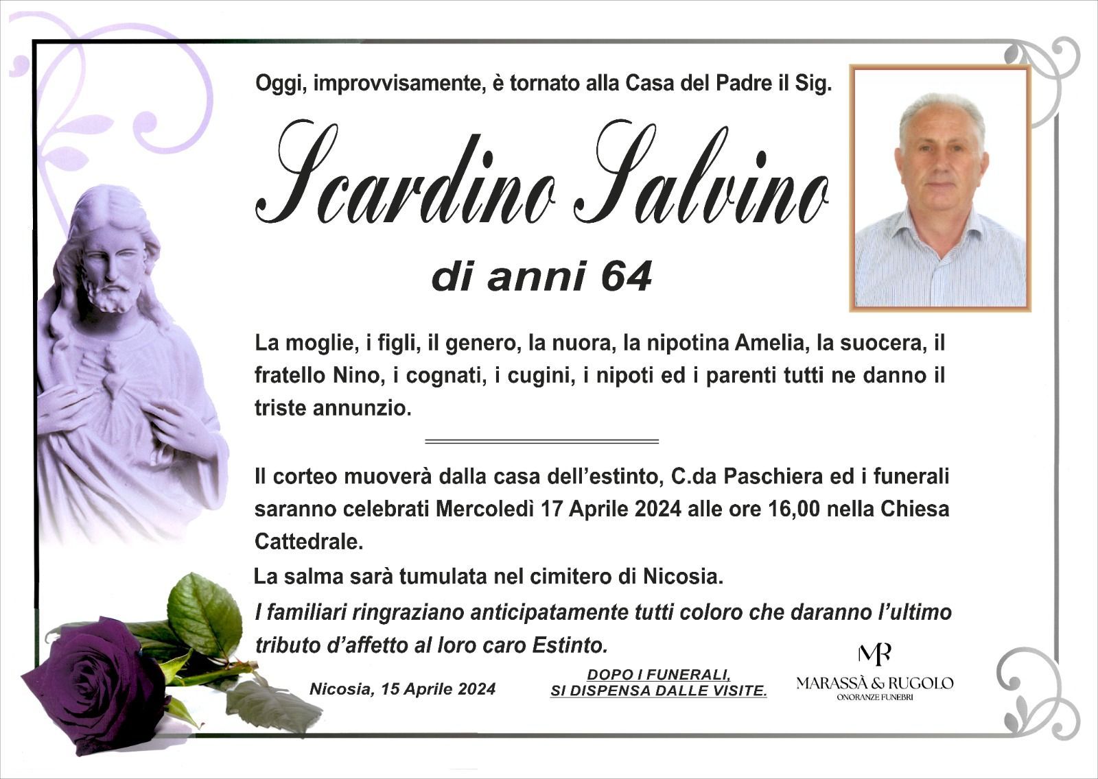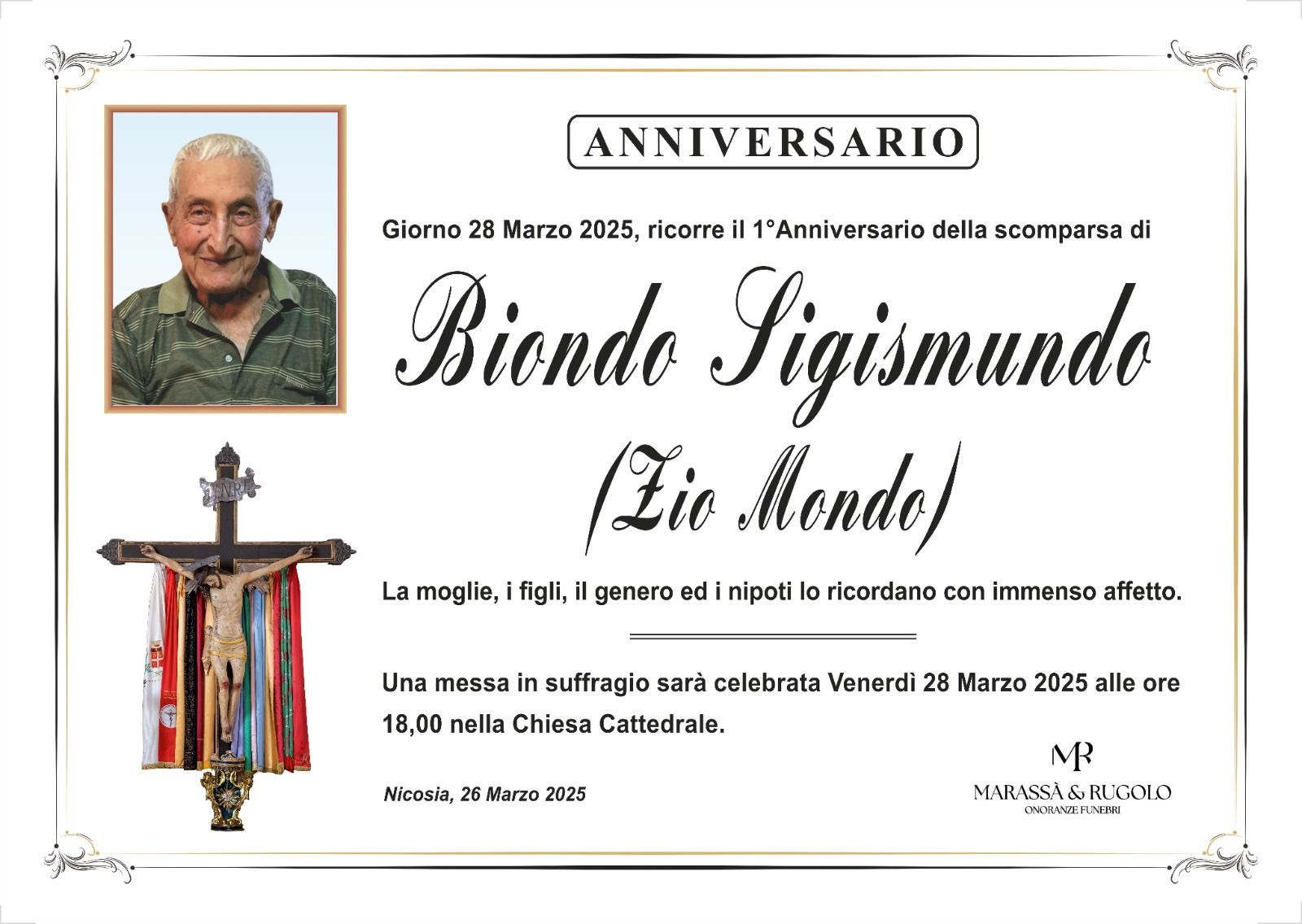 Dal 1980 l'agenzia di ONORANZE FUNEBRI MARASSA' & RUGOLO a Nicosia in provincia di Enna, effettua il disbrigo delle pratiche; trasporto delle salme in Italia e all'estero; realizzazione di articoli funerari; personalizzazione di marmi e graniti per lapidi. Ed ancora: addobbi funebri; allestimento camere ardenti; cremazione; disbrigo pratiche funerarie; pratiche cimiteriali; servizi funebri; servizi funebri completi; sigillatura casse e molto altro ancora.