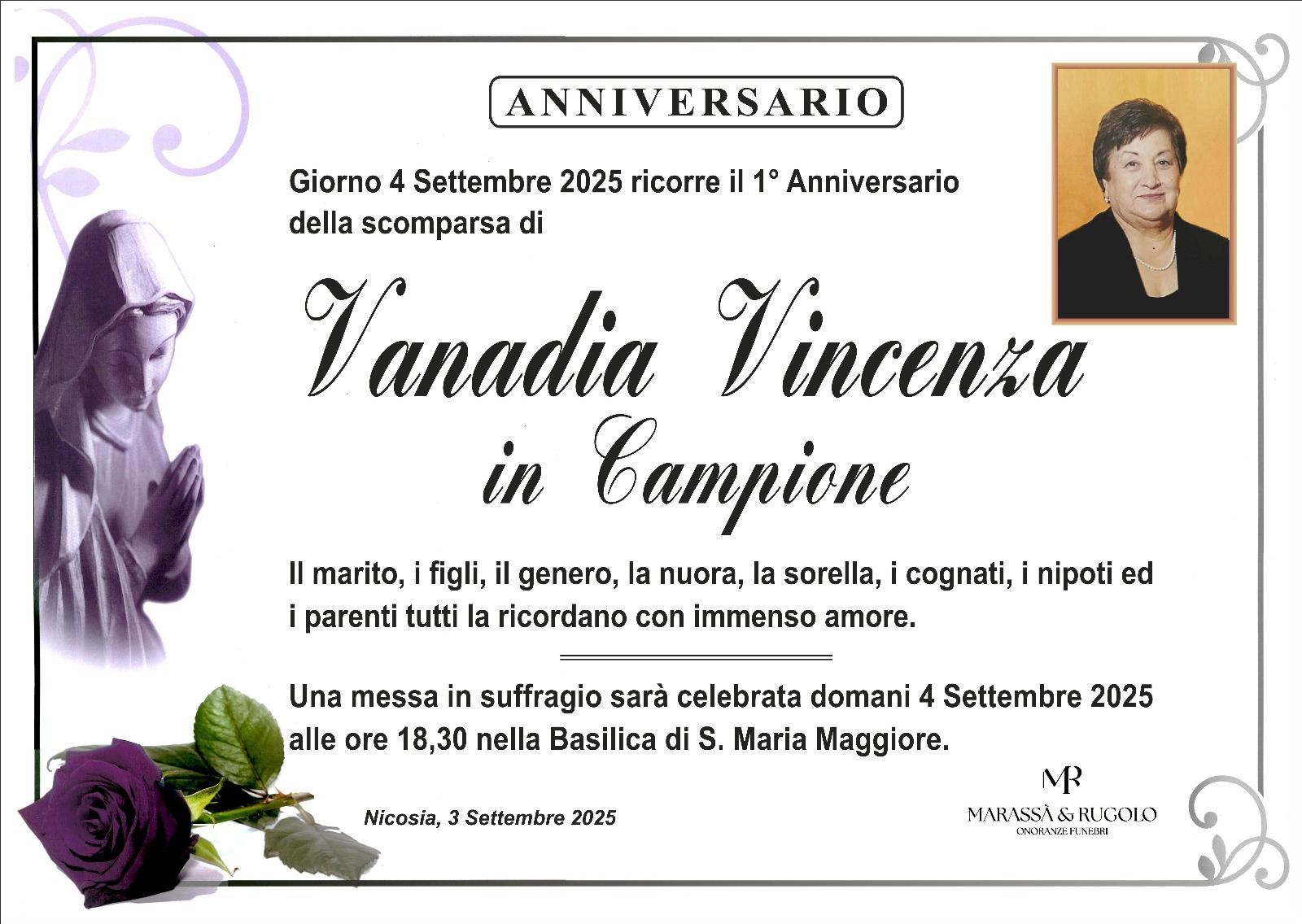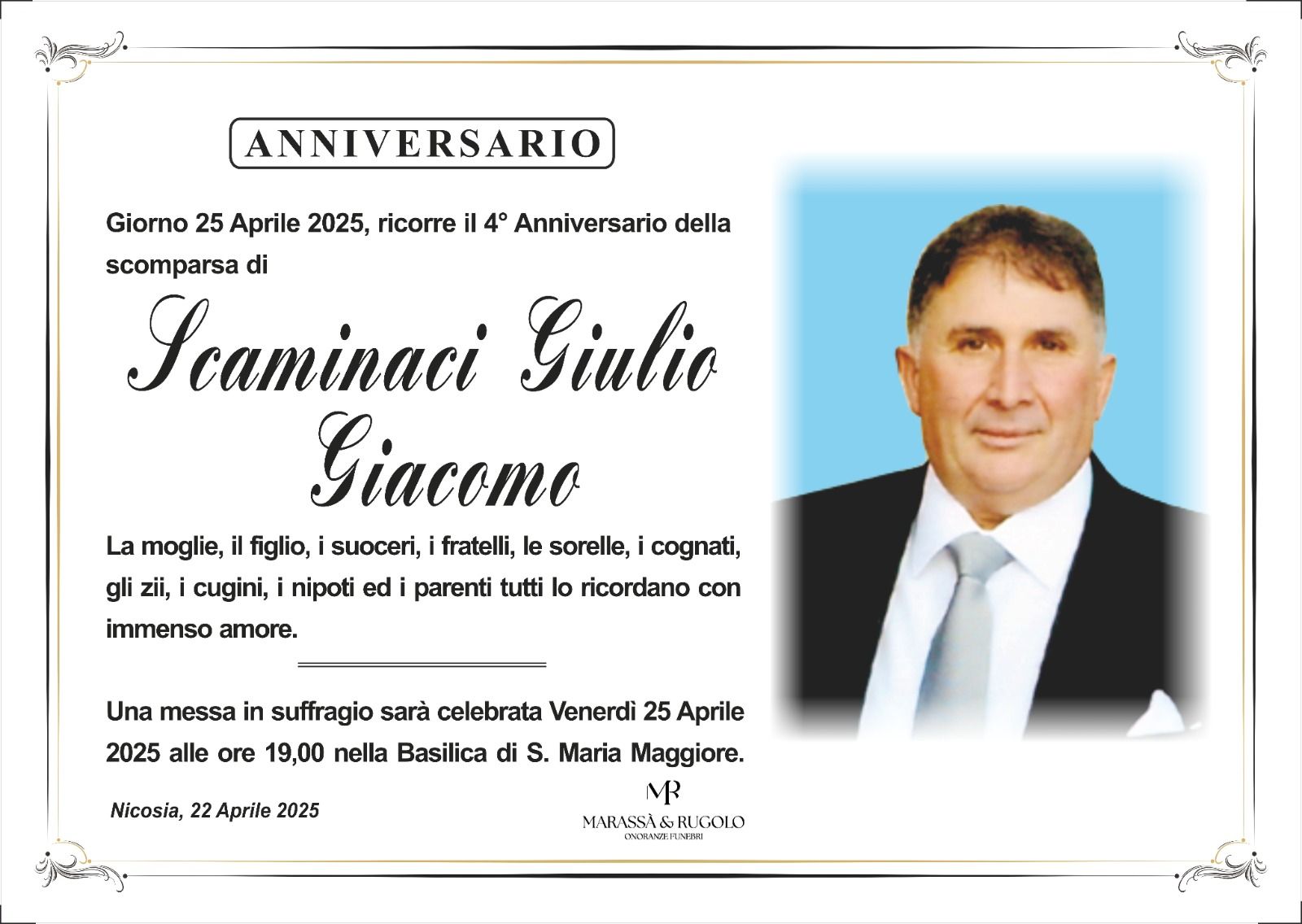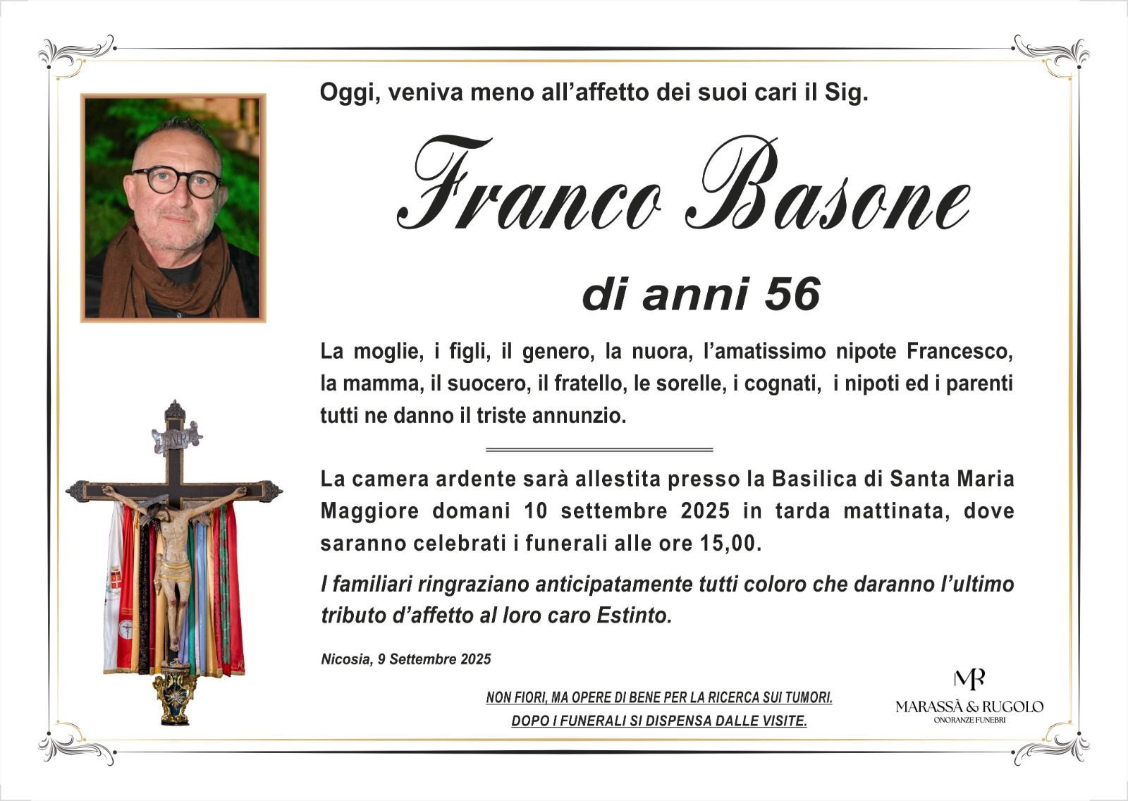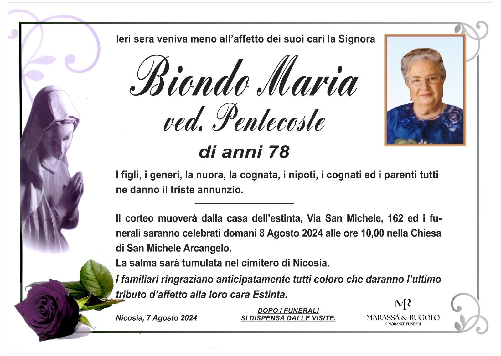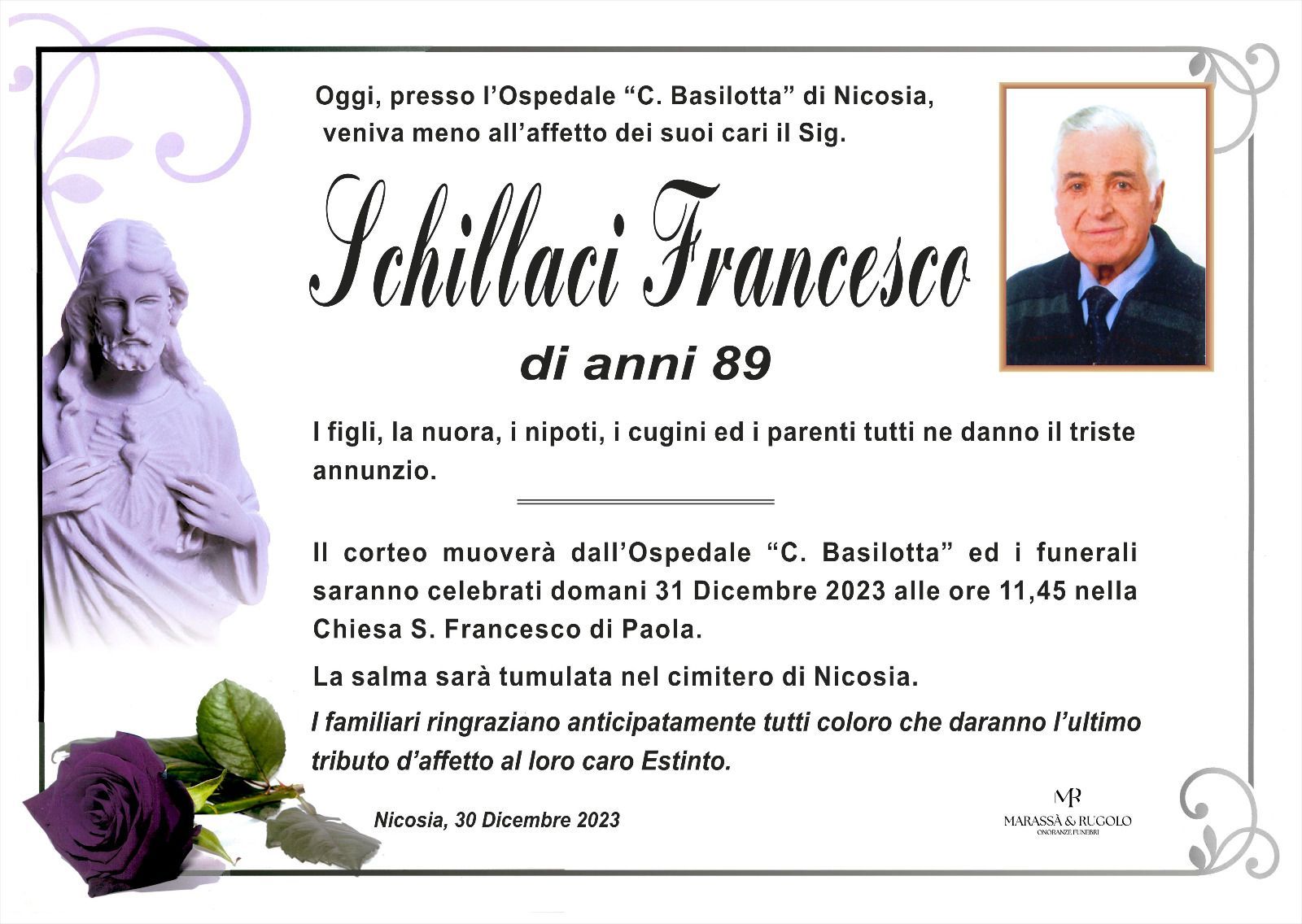 Dal 1980 l'agenzia di ONORANZE FUNEBRI MARASSA' & RUGOLO a Nicosia in provincia di Enna, effettua il disbrigo delle pratiche; trasporto delle salme in Italia e all'estero; realizzazione di articoli funerari; personalizzazione di marmi e graniti per lapidi. Ed ancora: addobbi funebri; allestimento camere ardenti; cremazione; disbrigo pratiche funerarie; pratiche cimiteriali; servizi funebri; servizi funebri completi; sigillatura casse e molto altro ancora.