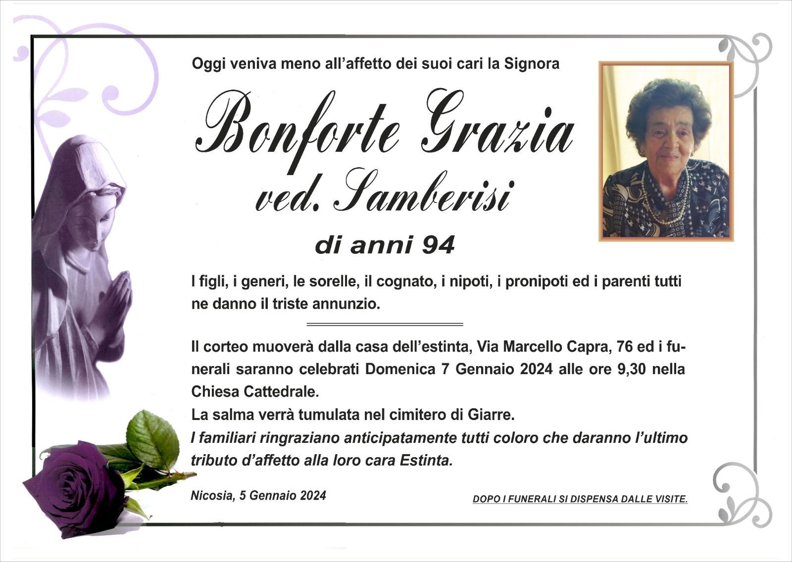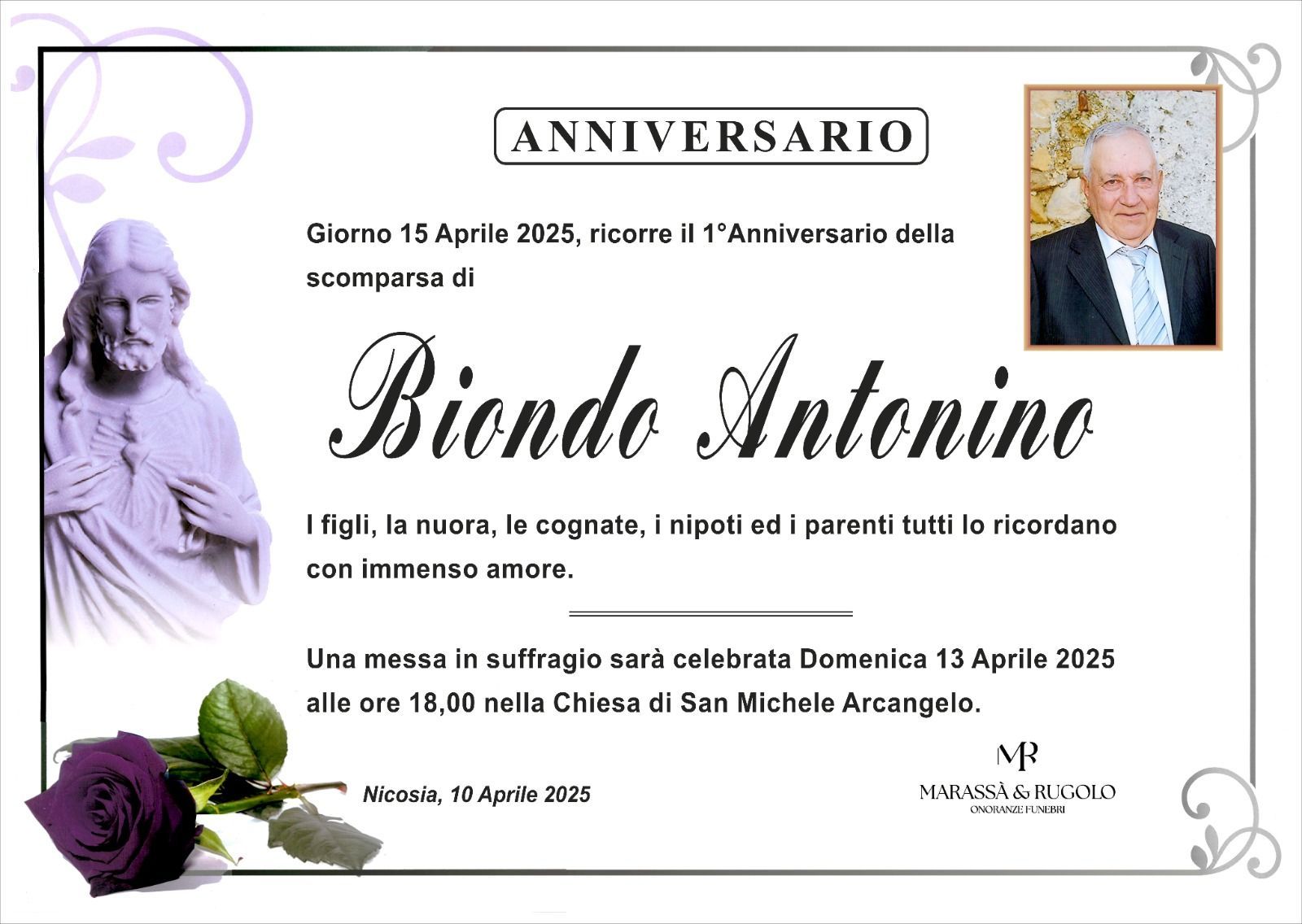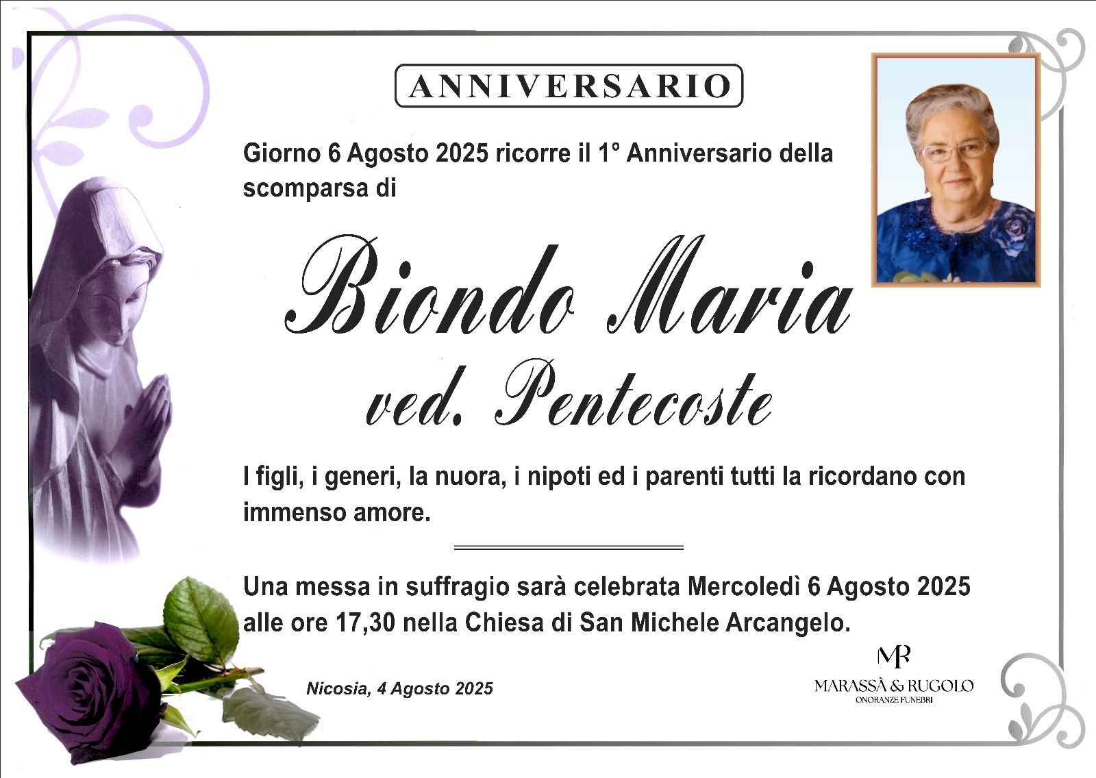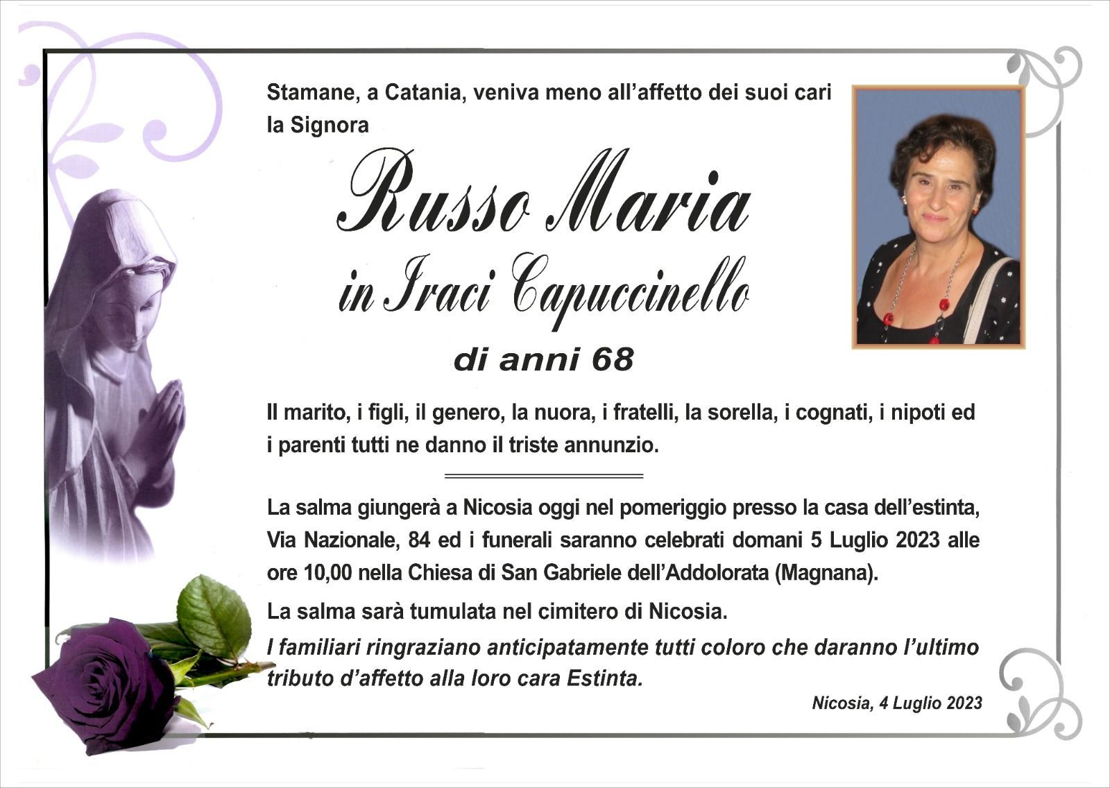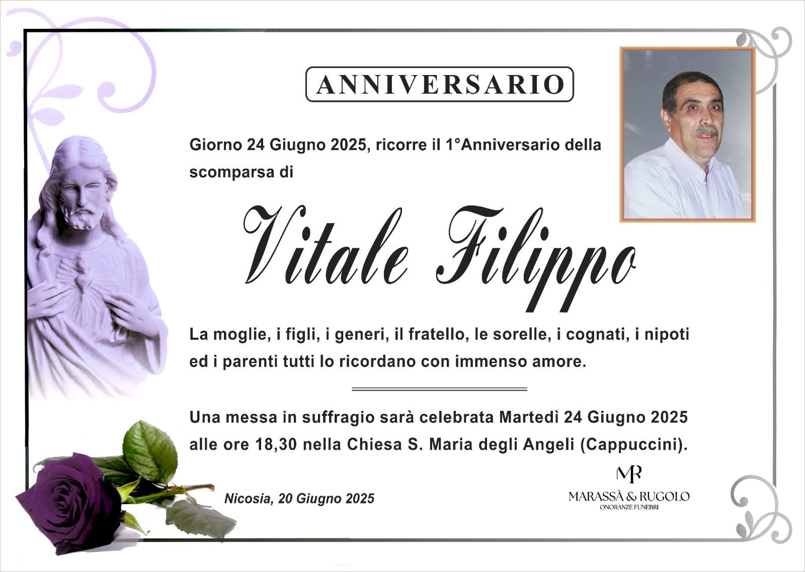 Dal 1980 l'agenzia di ONORANZE FUNEBRI MARASSA' & RUGOLO a Nicosia in provincia di Enna, effettua il disbrigo delle pratiche; trasporto delle salme in Italia e all'estero; realizzazione di articoli funerari; personalizzazione di marmi e graniti per lapidi. Ed ancora: addobbi funebri; allestimento camere ardenti; cremazione; disbrigo pratiche funerarie; pratiche cimiteriali; servizi funebri; servizi funebri completi; sigillatura casse e molto altro ancora.