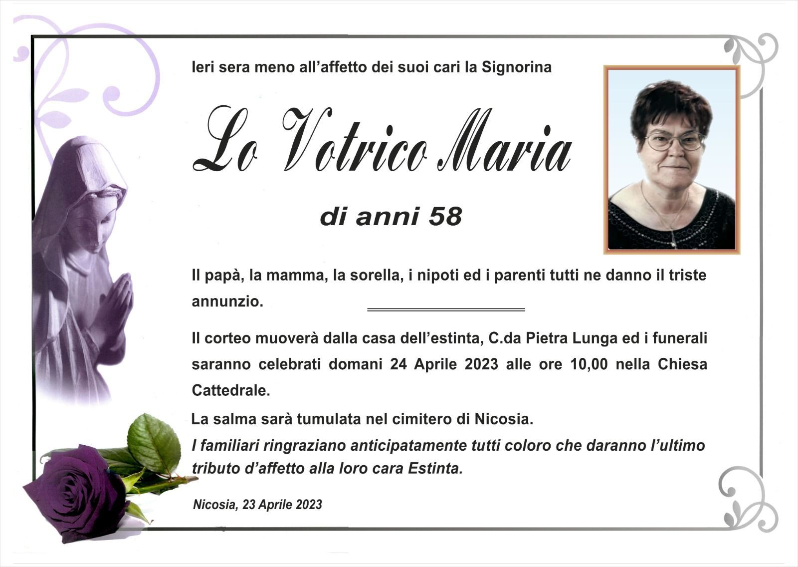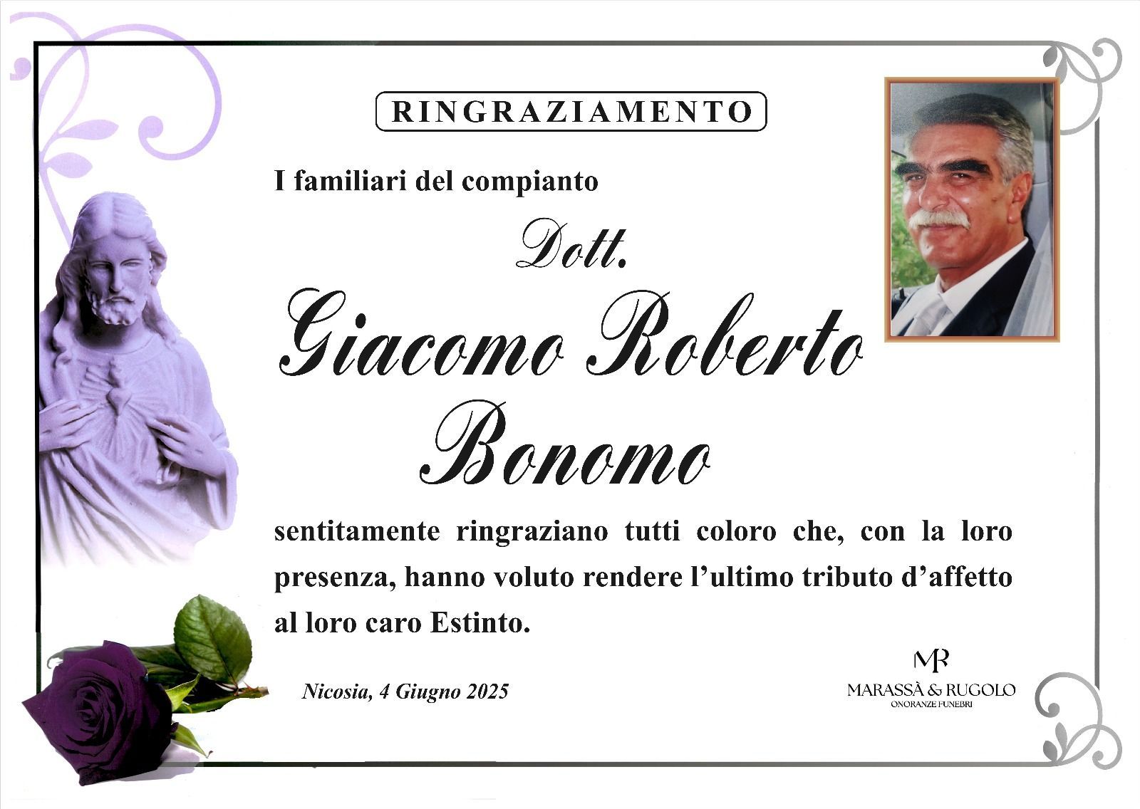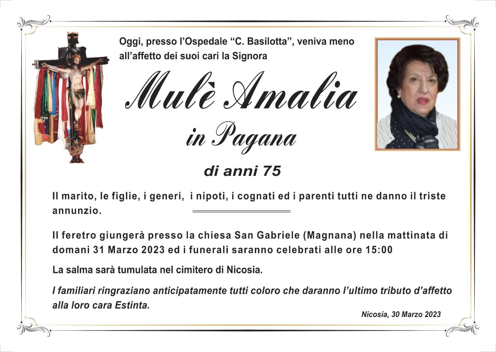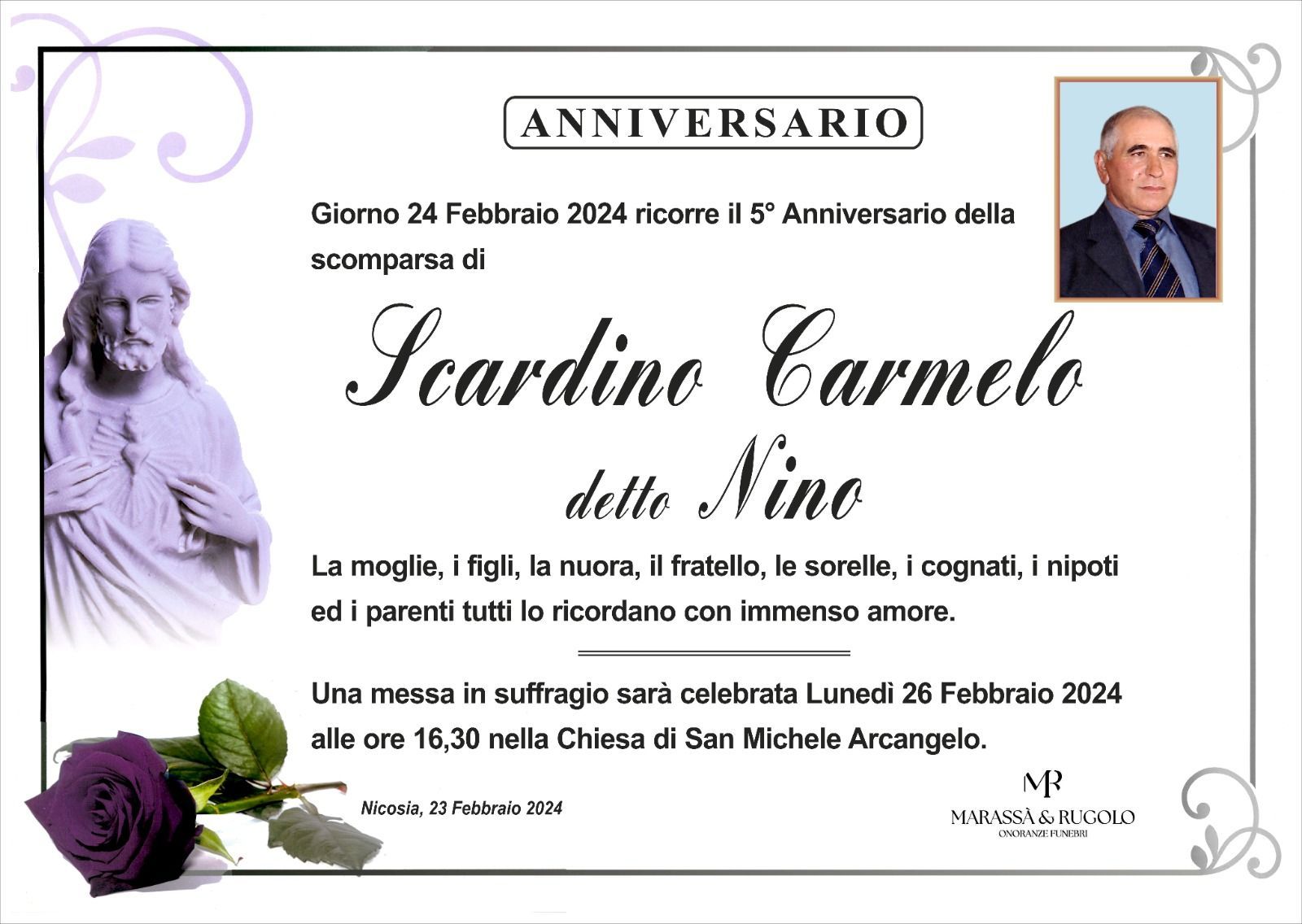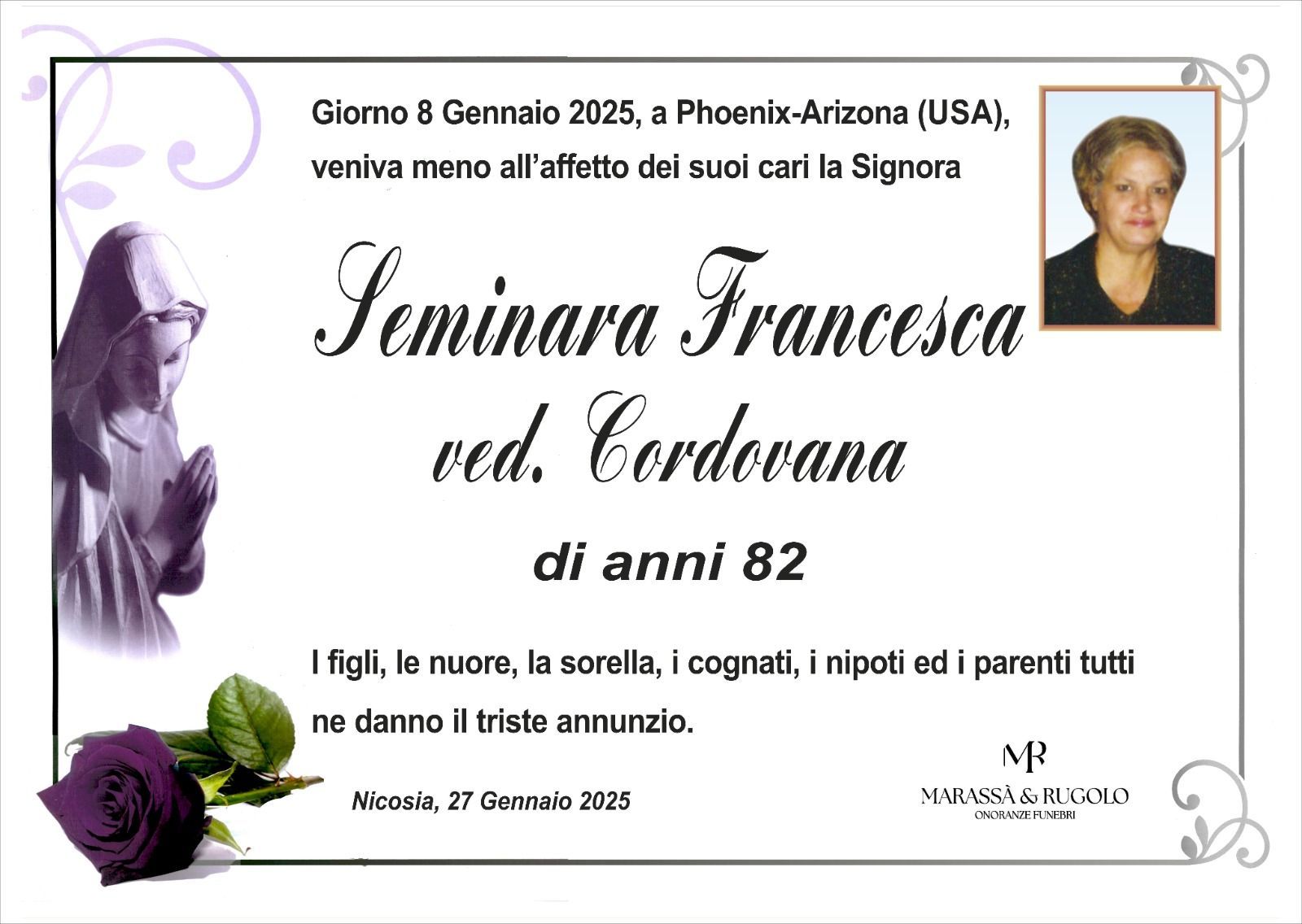 Dal 1980 l'agenzia di ONORANZE FUNEBRI MARASSA' & RUGOLO a Nicosia in provincia di Enna, effettua il disbrigo delle pratiche; trasporto delle salme in Italia e all'estero; realizzazione di articoli funerari; personalizzazione di marmi e graniti per lapidi. Ed ancora: addobbi funebri; allestimento camere ardenti; cremazione; disbrigo pratiche funerarie; pratiche cimiteriali; servizi funebri; servizi funebri completi; sigillatura casse e molto altro ancora.