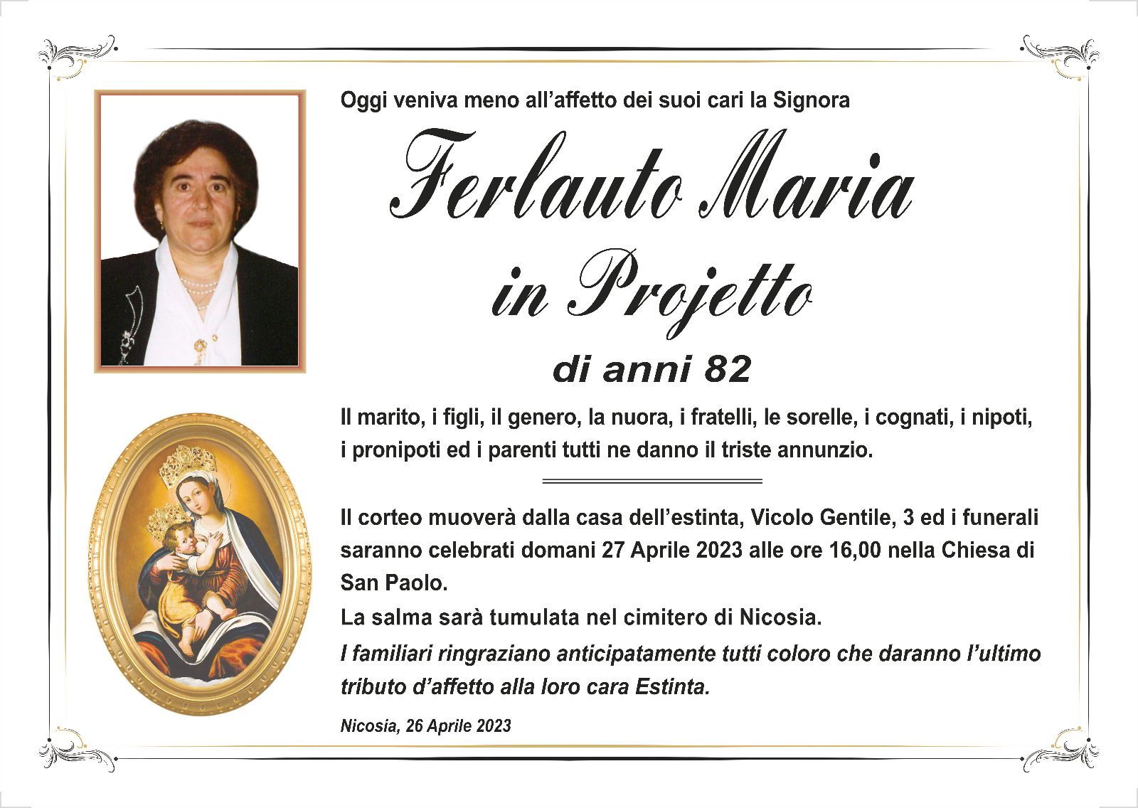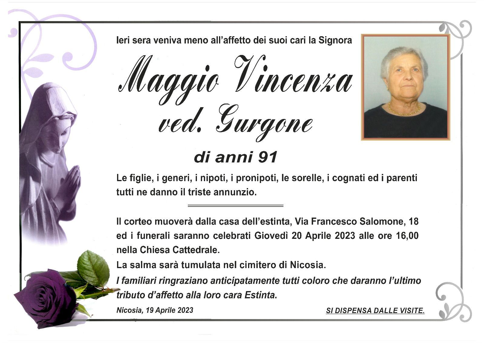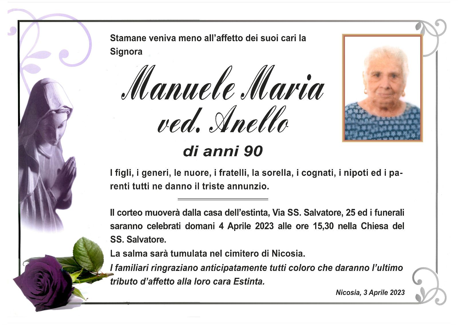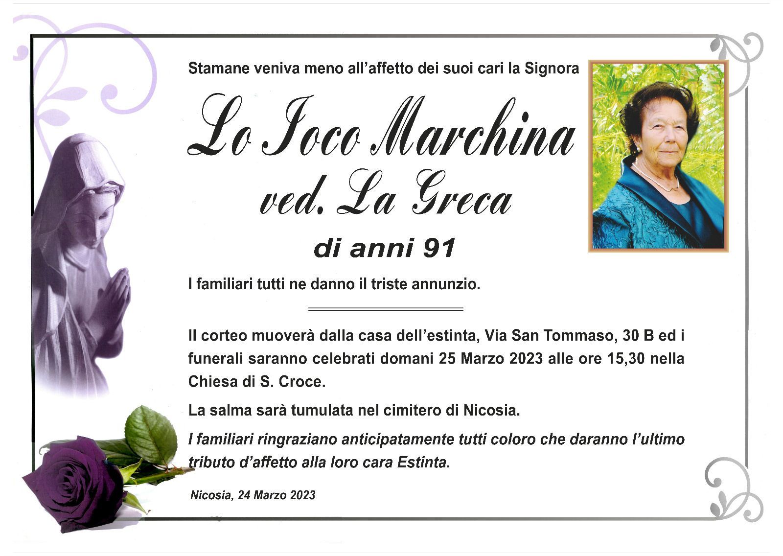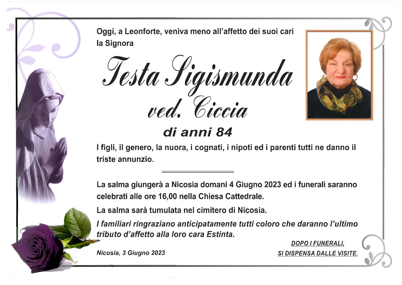 Dal 1980 l'agenzia di ONORANZE FUNEBRI MARASSA' & RUGOLO a Nicosia in provincia di Enna, effettua il disbrigo delle pratiche; trasporto delle salme in Italia e all'estero; realizzazione di articoli funerari; personalizzazione di marmi e graniti per lapidi. Ed ancora: addobbi funebri; allestimento camere ardenti; cremazione; disbrigo pratiche funerarie; pratiche cimiteriali; servizi funebri; servizi funebri completi; sigillatura casse e molto altro ancora.
