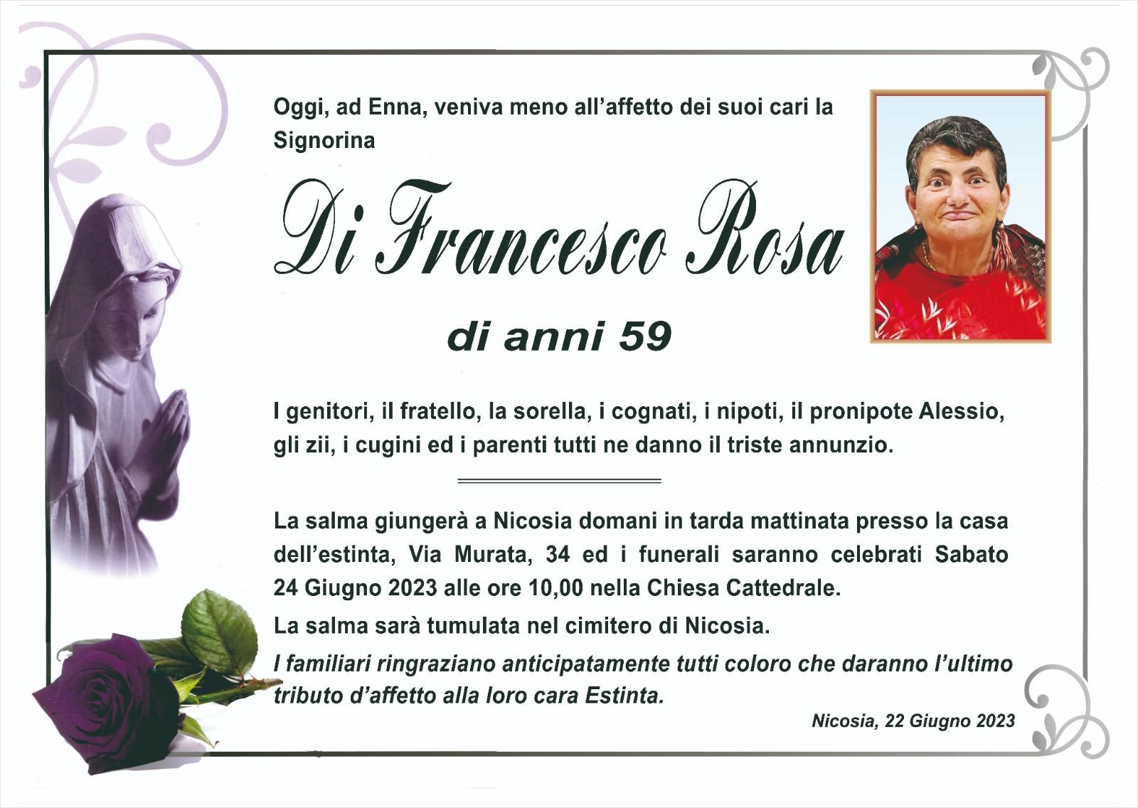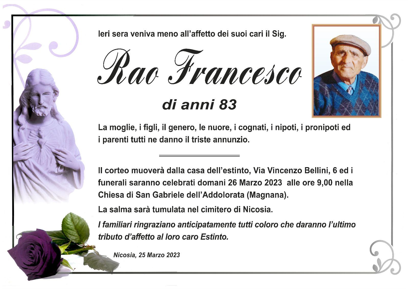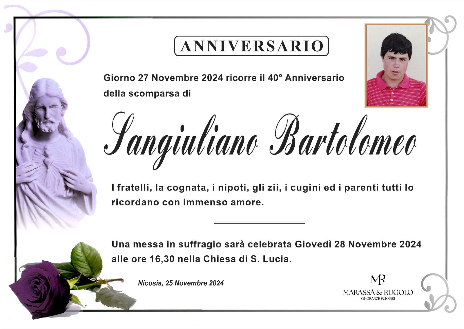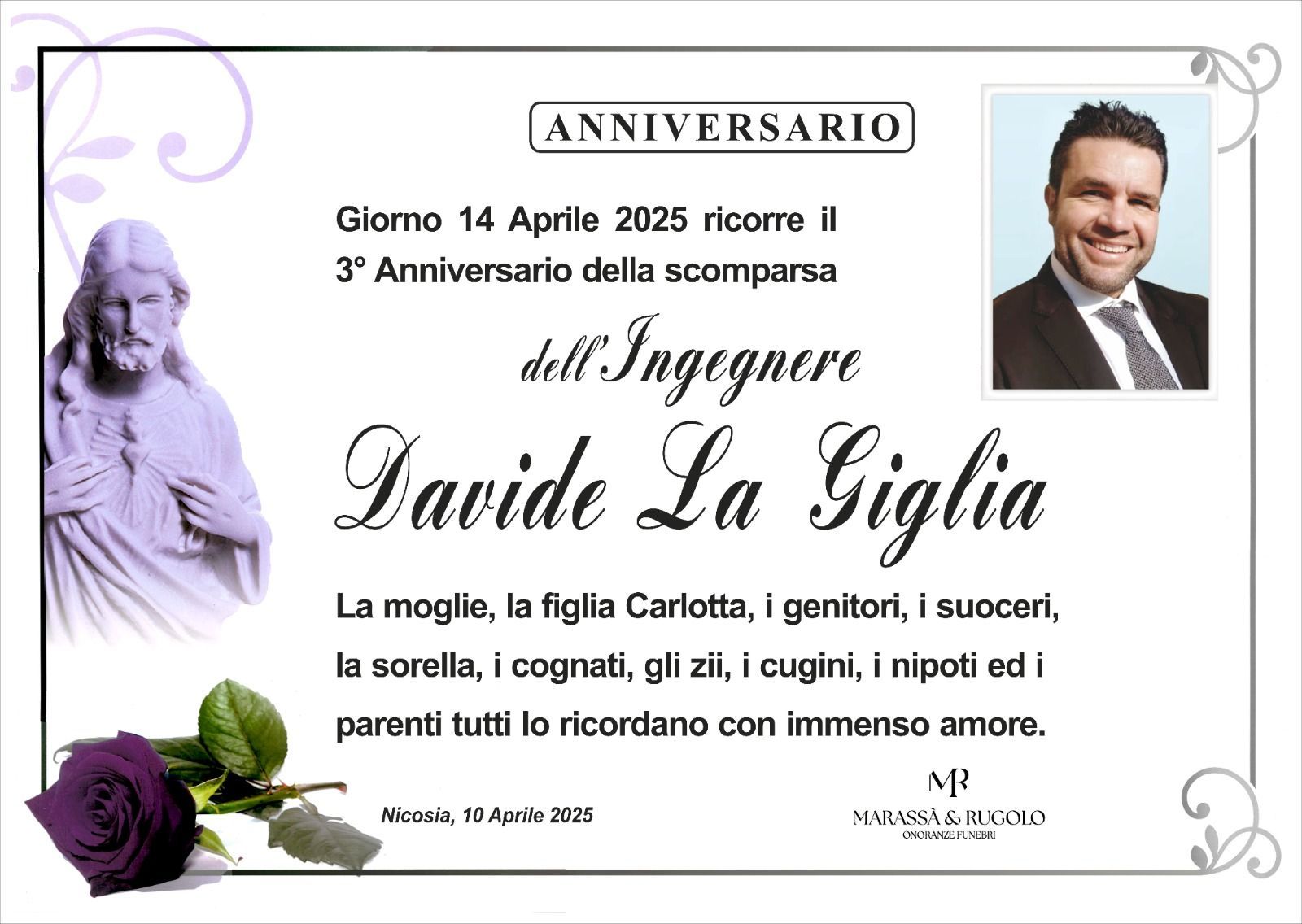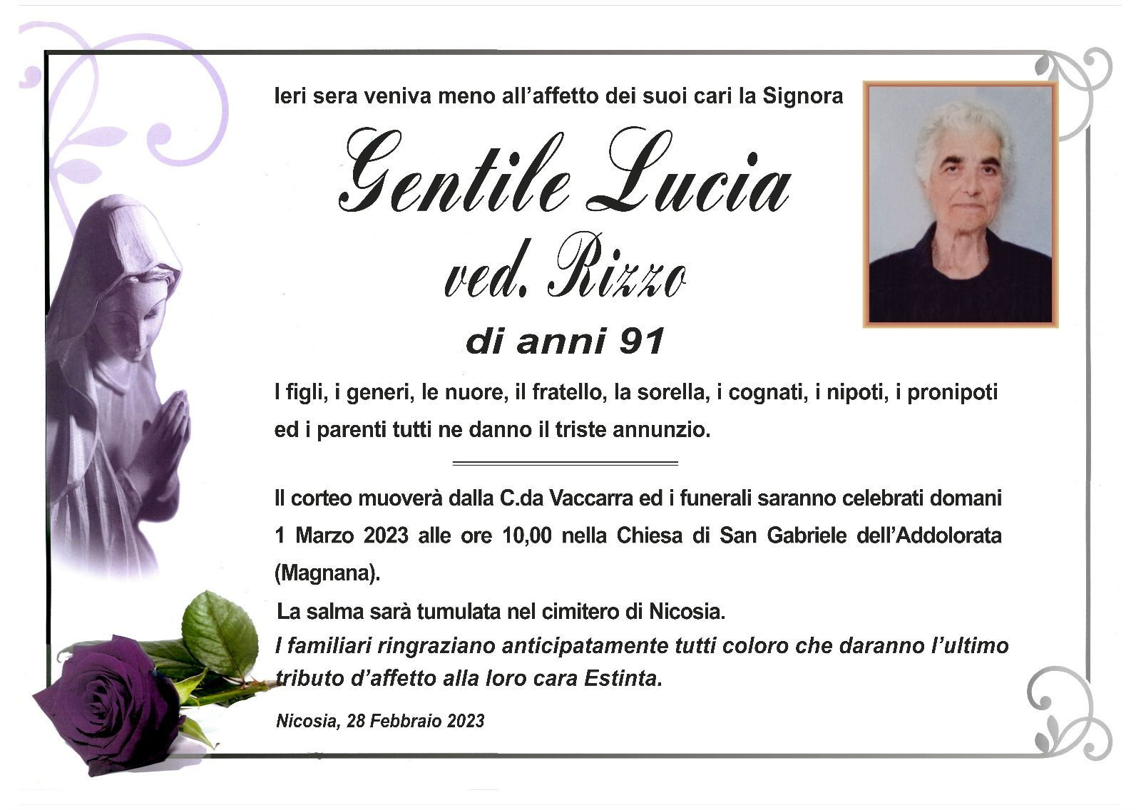 Dal 1980 l'agenzia di ONORANZE FUNEBRI MARASSA' & RUGOLO a Nicosia in provincia di Enna, effettua il disbrigo delle pratiche; trasporto delle salme in Italia e all'estero; realizzazione di articoli funerari; personalizzazione di marmi e graniti per lapidi. Ed ancora: addobbi funebri; allestimento camere ardenti; cremazione; disbrigo pratiche funerarie; pratiche cimiteriali; servizi funebri; servizi funebri completi; sigillatura casse e molto altro ancora.