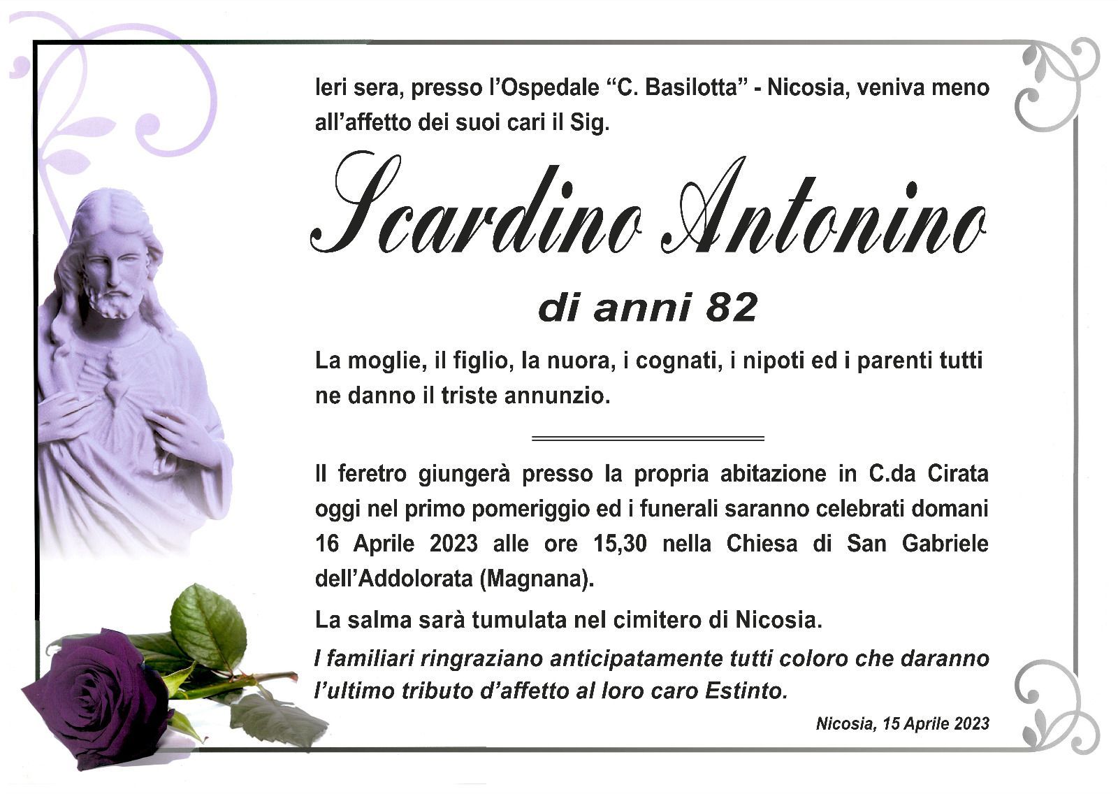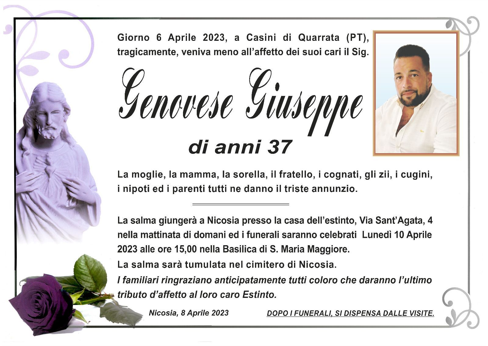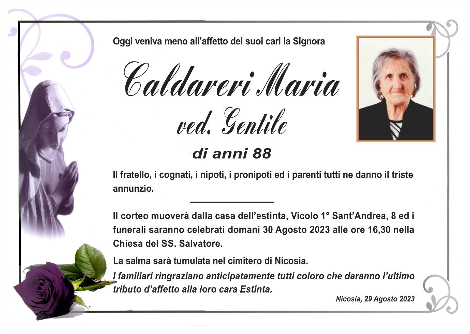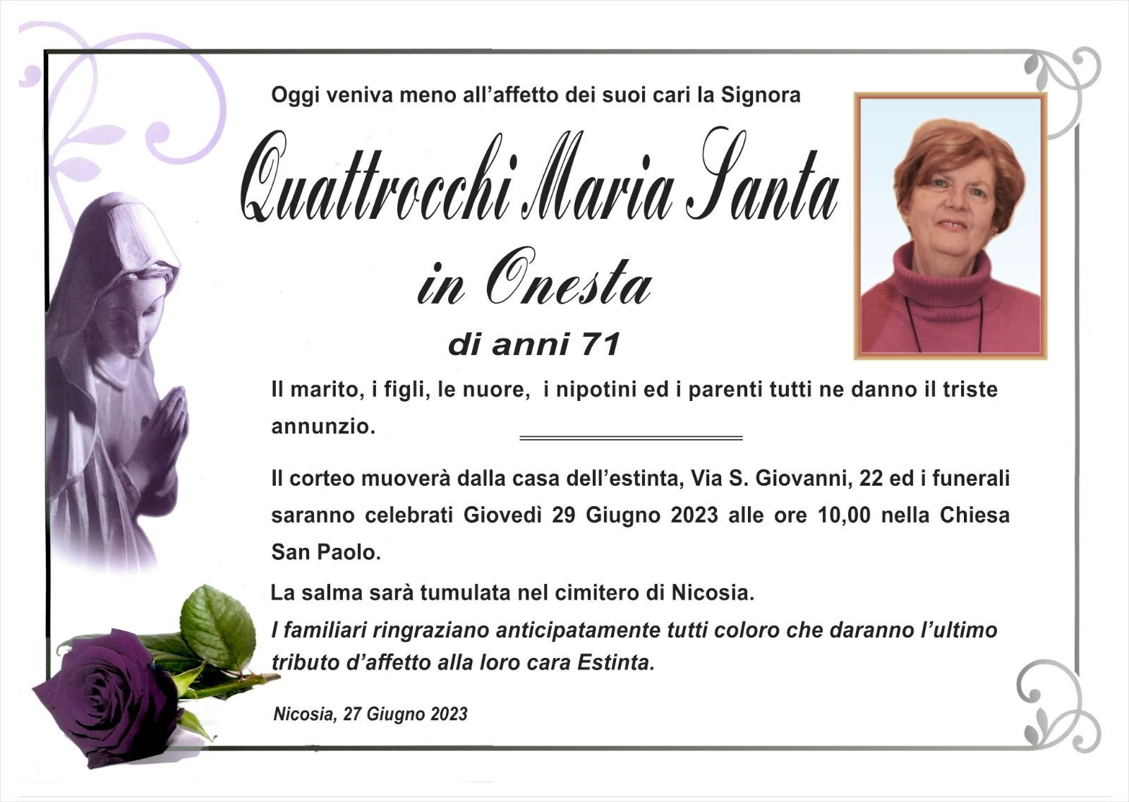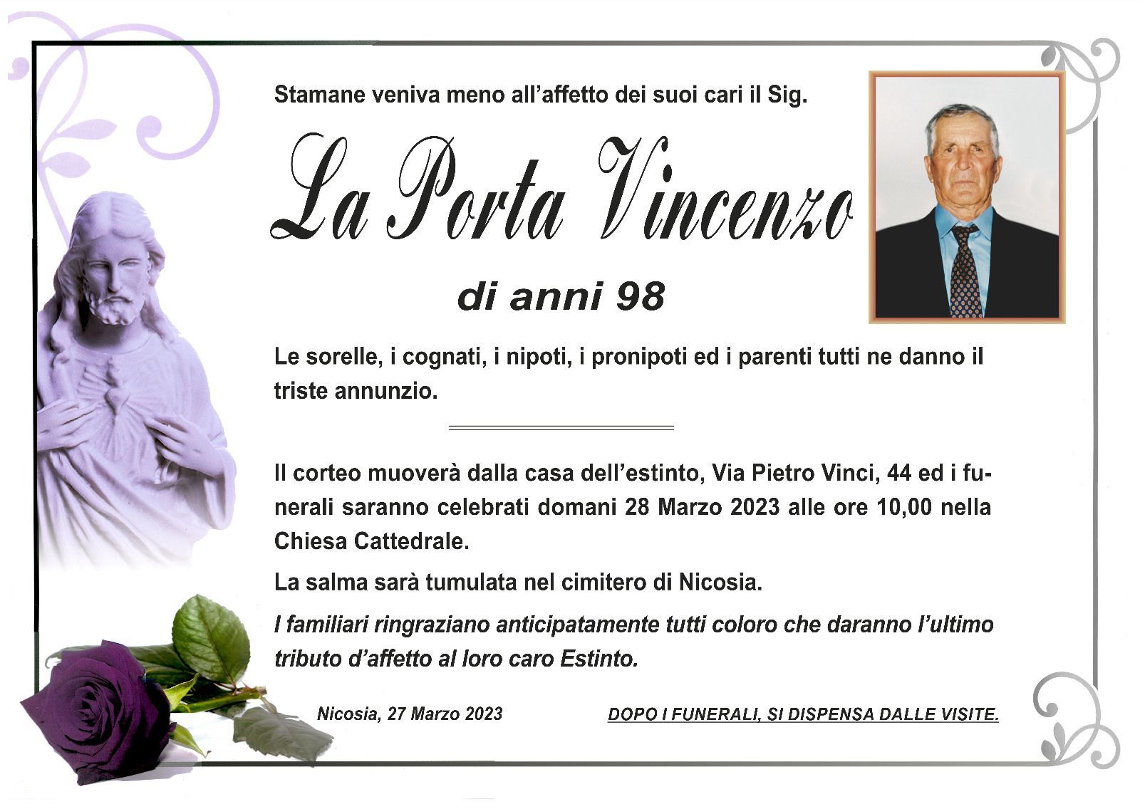 Dal 1980 l'agenzia di ONORANZE FUNEBRI MARASSA' & RUGOLO a Nicosia in provincia di Enna, effettua il disbrigo delle pratiche; trasporto delle salme in Italia e all'estero; realizzazione di articoli funerari; personalizzazione di marmi e graniti per lapidi. Ed ancora: addobbi funebri; allestimento camere ardenti; cremazione; disbrigo pratiche funerarie; pratiche cimiteriali; servizi funebri; servizi funebri completi; sigillatura casse e molto altro ancora.